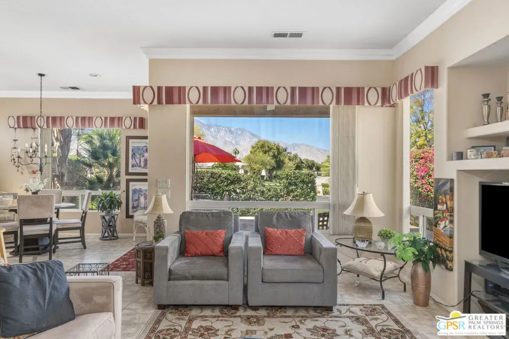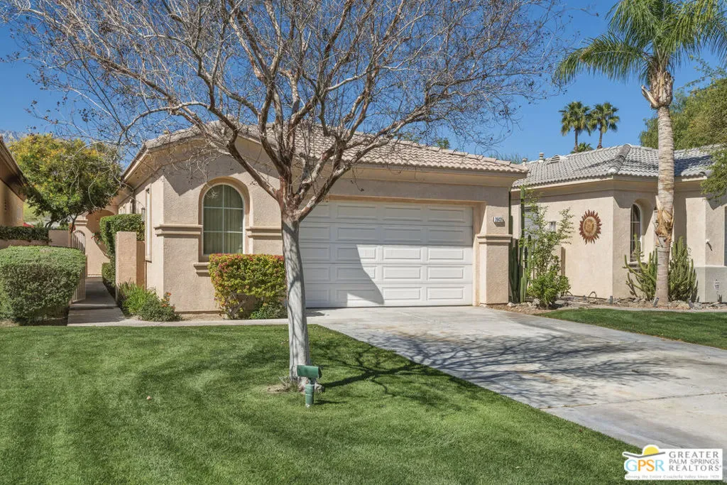 Located in the prestigious Desert Princess Country Club, this beautifully maintained desert retreat offers 2 bedrooms and 2.5 bathrooms across approximately 1,711 sq ft of living space with stunning western mountain views. The thoughtfully designed open floor plan features a spacious living room with a cozy fireplace, elegant crown molding, and a bright kitchen complete with granite countertops, backsplash, and a walk-in pantry. Both bedrooms are generously sized primary suites with walk-in closets, creating ideal comfort and privacy for residents or guests. Additional highlights include an attached two-car garage with storage and turnkey furnishings. Residents enjoy resort-style amenities within the 24-hour guard-gated community, including a 27-hole championship golf course, 33 swimming pools, tennis courts, fitness center, and vibrant clubhouse with dining and social events, all just minutes from shopping, dining, and Palm Springs International Airport.