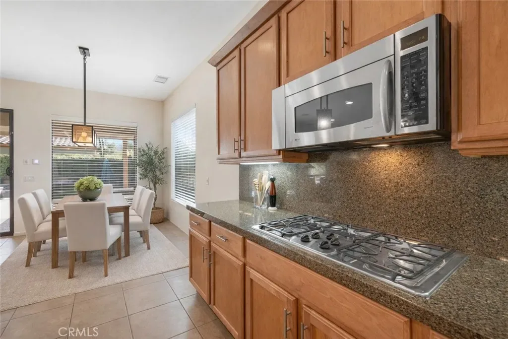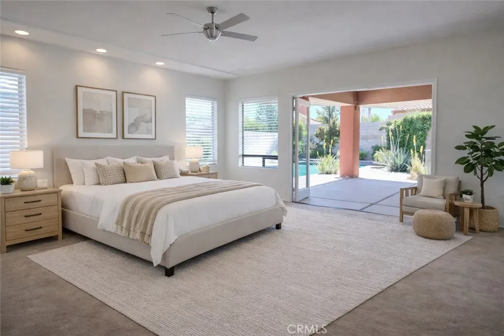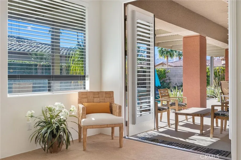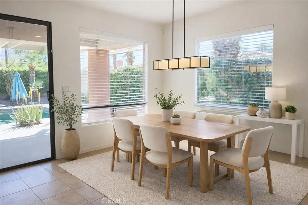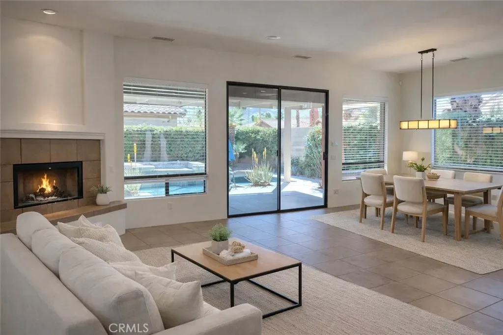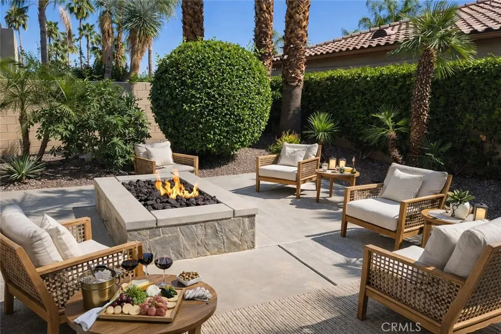 This upgraded contemporary home sits on an oversized interior corner lot and delivers the privacy, openness, and indoor/outdoor flow today’s buyers want. The main home offers 3 bedrooms, 3.5 baths, and a versatile den/office/flex room, plus a detached guest casita—perfect for visiting family, guests, or a private retreat. Entertain with ease in the open kitchen featuring slab granite countertops, dual ovens, and a large breakfast bar that opens to the great room and covered patio. The backyard is a professionally landscaped desert oasis with a saltwater pool and spa, fire pit, mountain views, mature citrus and fig trees, dramatic palms/cacti, and landscape lighting that transforms the space at night. Two fireplaces—including a courtyard fireplace by the casita and a poolside large fire pit add warmth and ambiance throughout. Enjoy modern comfort and efficiency with a whole-home speaker system, dual Lennox HVAC systems, and an assumable Vivint solar lease for lower monthly utility costs. HOA is just $340/month and includes a complimentary Social & Fitness Membership to Mission Hills Country Club which is a huge value. Minutes to golf, dining, and Palm Springs—luxury, comfort, and lifestyle all in one. Furniture is digitally staged for what your dream home could look like!