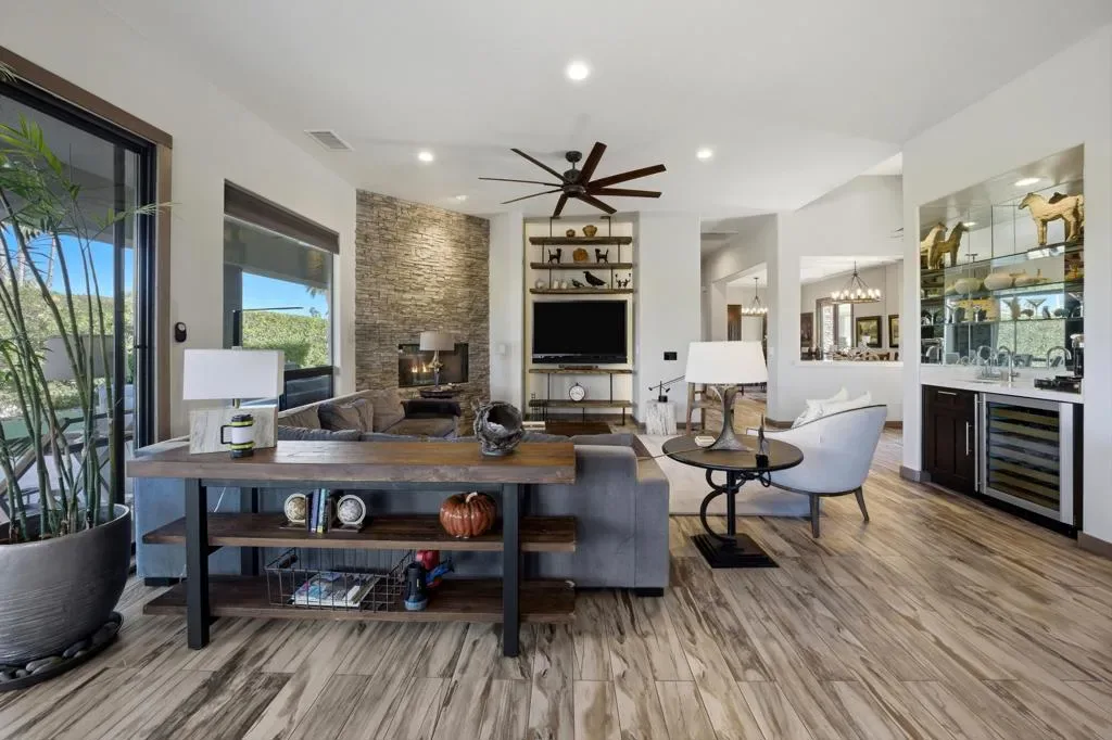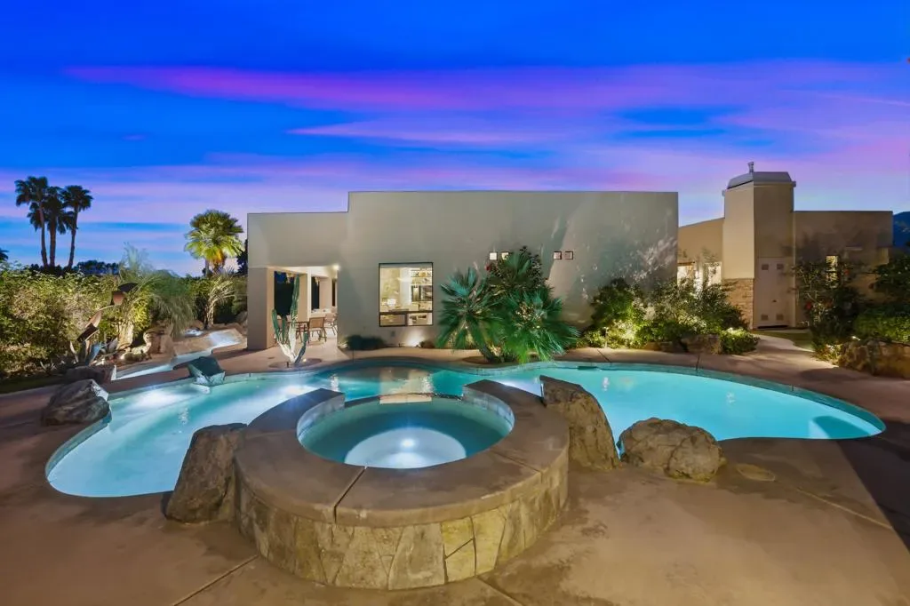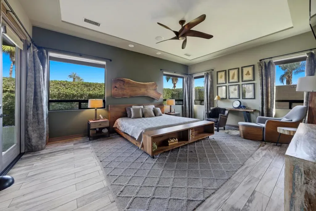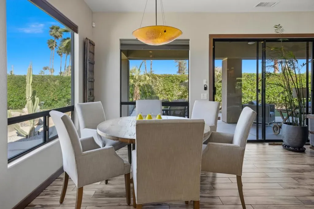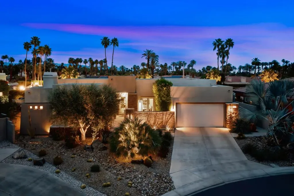 A very rare and exceptional find is now available and located in Montage at Mission Hills, a gated community of 128 homes adjacent to Mission Hills Country Club. This reimagined and updated open- concept home is on a large corner lot over 12,000 sf. This outstanding home is approximately 2,624 sf with 2 guest houses/casitas, each with its own new mini-split AC, full bath, and new water heater. You will find 54 owned solar panels, and two large AC units for the main house that have a high SEER efficiency rating. This home has 4 bedrooms (one currently being used as an office), 4 1/2 bathrooms including a powder room, 3fireplaces (two exterior of the casitas and one in the great room), a wet bar complete with a beverage cooler. The flooring is porcelain wood-look tile that runs throughout the main house. The kitchen is a chef’s dream offering a large center island with Murano glass pendant lighting, quartz counter tops, a Thermador 6-burner gas stove with two ovens, an additionalwall oven, microwave oven, and even a warming drawer. There is plenty of space for relaxing or entertaining in the private front courtyard, the back and side yards with decking and turf, the large covered patio, and grilling area with a brand new grille. The awesome, one-of-a-kind pool is wrap-around style with boulders, a raised spa, water feature, and foot bridge. This home comes complete with a new roof too! The HOA Dues are only $360/mo and includes a Membership to adjacent Mission HillsCountry Club in Rancho Mirage, including all amenities except golf. 4BD/4.5BA, 2624 SF, located on Fee land so you own the land. See attached list of Upgrades and Improvements.