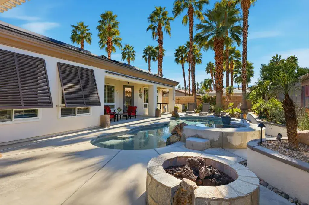 Welcome to Montage–an in-demand gated desert community offering low HOA dues that include a social membership to Mission Hills! Enjoy country club living without country club prices! This Mediterranean-inspired residence showcases beautiful stacked-stone accents and is the largest floor plan in the community, anchored by a 3 car garage with an EV charger. Energy-smart features include a 24 panel solar PPA (power purchase agreement), newer HVAC units, Bermuda and plantation shutters, and new west-facing windows to help keep utility costs low. Water-wise artificial turf maintains pristine curb appeal year-round. A private casita with its own patio and cozy outdoor fireplace, offers ideal guest accommodations or flexible living space. The sunny, resort-style backyard is an oasis with a heated saltwater Pebbletec pool and spa, pergola, built-in BBQ with island and new landscape lighting –perfect for casual entertaining. Don’t miss this rare opportunity- schedule your private showing today!