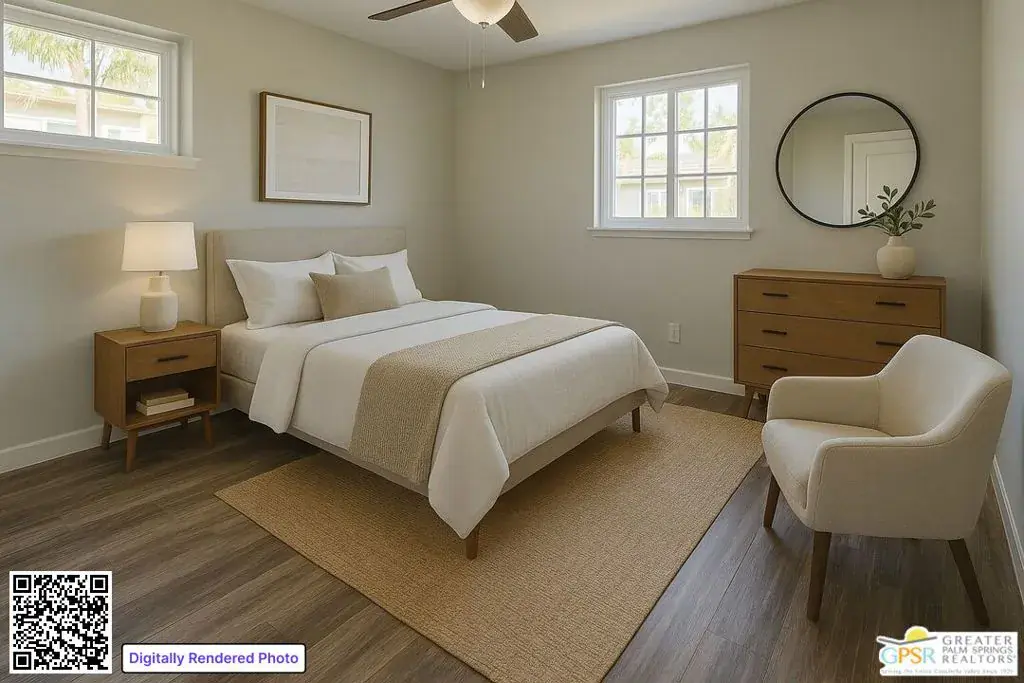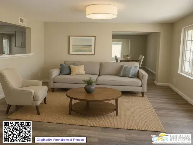 Wake-Up moment for a house that’s priced to sell. Step into a timeless mid-century modern style in this thoughtfully updated home, designed for both comfort and functionality. The open floor plan creates a seamless flow between living spaces, making it perfect for everyday living and easy entertaining. This home offers three generously sized bedrooms and two well-appointed bathrooms, providing flexibility for families, guests, or a home office. The attached garage has been converted into additional usable space that’s ideal for a bonus room, studio, or private retreat while the carport and driveway still provide convenient parking and storage. Out back, you’ll find a great mix of green space and low-maintenance landscaping, with a grassy area for relaxing or play alongside desert-style elements that add character and keep upkeep simple. There’s also plenty of room to add a pool, giving you the chance to create your own outdoor oasis. Located in a quiet, centrally situated neighborhood, this home is just minutes from markets, dining, and everyday essentials, making daily life both easy and convenient, all complemented by a manageable desert landscape. Extreme drop in price for this grand property will invite any potential buyer. Turn-key and move-in ready. Provides solar for saving energy. Desert curb appeal. Make it your home or an investment.