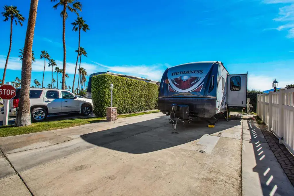 Discover this fantastic starter package in a prime resort location! This beautiful wall lot, conveniently located near La Palma Clubhouse and Satellite C, offers a private retreat with a lush greenbelt behind. Included is a 2018 Heartland Wilderness RV in like-new condition, providing the perfect balance of comfort and style. Whether you’re looking for a seasonal escape or a full-time haven, this lot and RV combo is an incredible opportunity to own a piece of resort living. Outdoor Resorts Palm Springs is a Five Star RV Resort Community combining luxury with affordability. It is a guard gated resort that sits on 137 beautifully landscaped acres with 27 holes of executive golf, 10 tennis courts, 13 pickleball courts, 8 swimming pools, a fully equipped fitness center, sports bar, beauty salon/barber shop, full-service restaurant, convenience store, 2 club houses, activities, special events and so much more.
