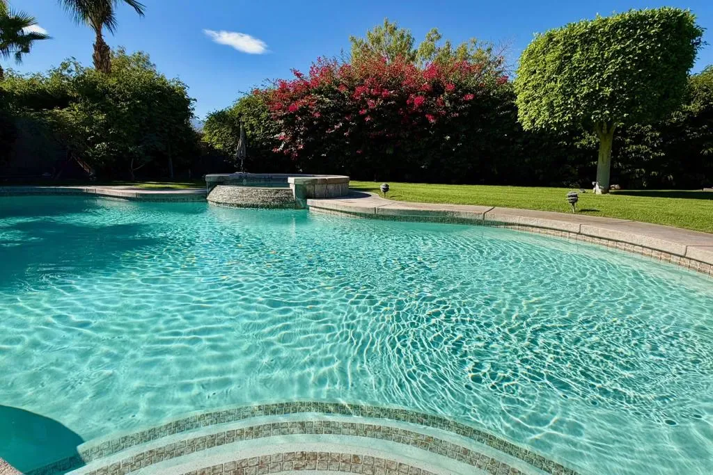 Price adjustment! Enjoy the serenity of a small, gated community – conveniently located between Rancho Mirage and Palm Springs. This freshly painted, 2463 square foot home is a spa oasis: lush, private landscaping, a heated pool/spa, and beautiful views of the Santa Rosa & San Jacinto mountains – all on fee-simple land. You enter the home through a courtyard into the welcoming entry rotunda. Ahead will be the large great room with high ceilings, gas fireplace and beautiful views of the pool, landscape and mountains. To the left of the great room is the large kitchen with granite counters and stainless (gas) appliances — and an inviting dining area. Heading through the kitchen toward the 2-car garage, you’ll find the laundry room (with washer/dryer/sink) and a convenient office area. Heading from the kitchen toward the rotunda, you’ll pass the walk-in kitchen pantry and half bath before reaching the first of three bedrooms. This bedroom/den features double doors and a 3/4 en-suite bathroom. Continuing down the hallway — to the right is very large second bedroom with full en-suite bathroom and a separate dressing/sitting area. Down the hall is the primary bedroom – a serene setting with gas fireplace, access to the covered patio and pool, beautiful views of San Jacinto Mountains and a large en-suite bathroom with soaking tub, shower stall, double vanities and a large walk-in closet. This home features a leased Solar panel system, and a recently installed HVAC system (2023) and water heater (2024).