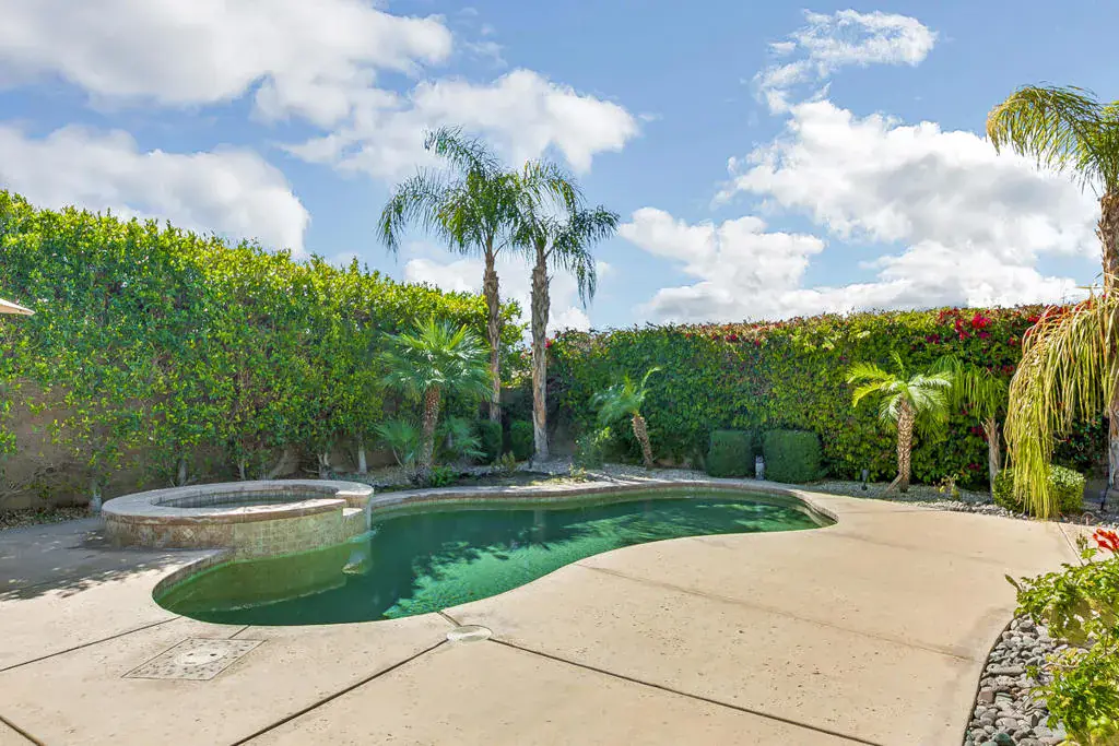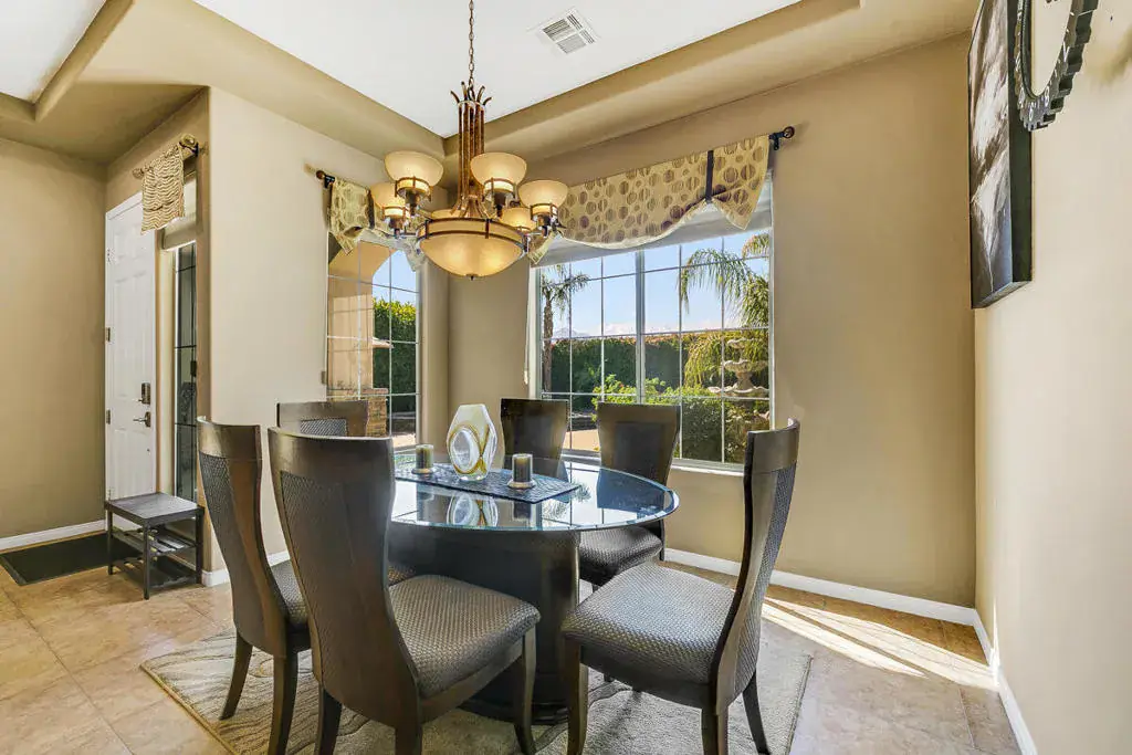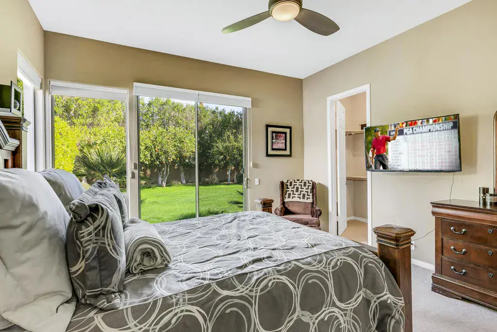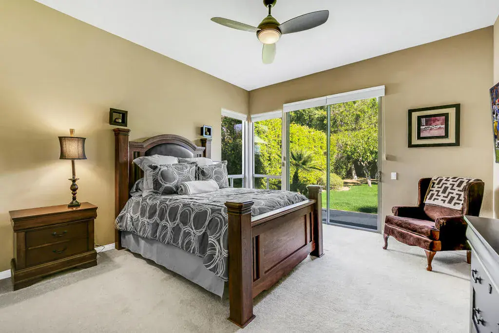 Available for the season 2026 at $6,500/mo Jan-Apr, $6,000/mo Oct-Dec or long term at $4,500/mo. You found a hidden gem!!! This immaculate, beautifully furnished home is located in the very small gated community of Rancho Paloma, within a block away from Mission Hills C.C. A beautiful pebble tech pool/spa welcomes you as you go through the private gate while admiring the breathtaking mountain view. You can also enjoy this view from the great room while cooking, dining or entertaining. The living room has a cozy mini bar as well as a desk for your laptop. The gourmet kitchen has beautiful granite countertops, stainless steel appliances and a spacious walk-in pantry equipped with a wine cellar. Each bedroom has a flat-screen TV with a walk-in closet. The master bedroom and the second bedroom has an access to a huge backyard with gorgeous palm trees and beautiful citrus trees. The master bedroom has a oversized walk-in closet as well as a large bathtub separated from a shower. Enjoy built-in BBQ with countertop and chairs outside while looking at the spectacular view. Seasonal rental includes utilities with $200 cap/mo. Long term does not include utilities.