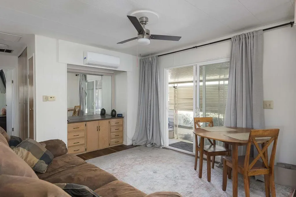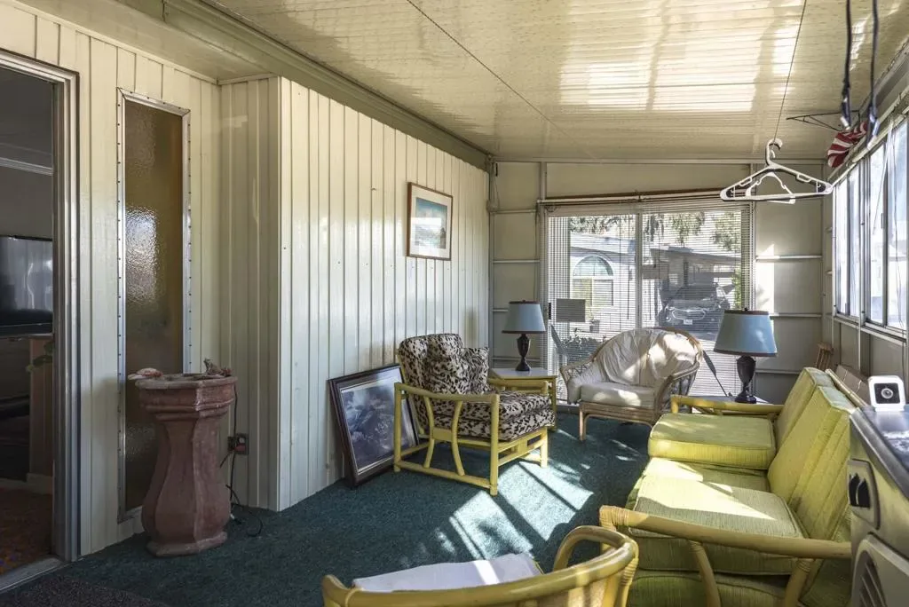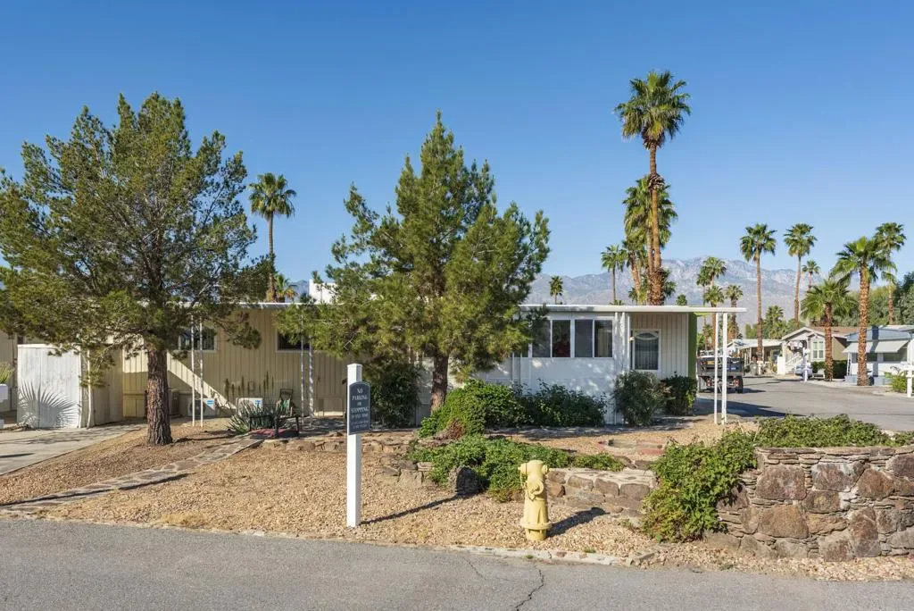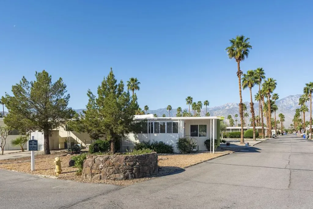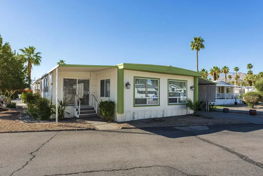 Check out this nicely updated Royal Palms Mobile in Central Cathedral City. This 1969 Royal Lancer Model has 2 Bedrooms & 2 Baths featuring a large corner lot with extra parking. As you enter, you have a nice Sun room that leads to the 1368 sq. feet of living space. The Dual Pane windows were replaced in ’22 and 3 Split A/C units installed in ’23. The exterior has been painted in 2026 ! There is a large combo Living Room and Dining Room area, which leads to the galley kitchen with a full array of white appliances. The original Formica countertops are in excellent shape. The flooring has been replaced with a rich and warm laminate throughout. The rear oversized Primary Suite has dual sinks and a nice walk-in shower. The guest bedroom has closet space and separate bath with step-in shower. There is a full-sized Washer/Dryer in Hall closet. The new foam roof has been installed recently and there is ample parking for two cars of off street parking in carport. There are also two storage sheds for extra storage needs. Royal Palms monthly lot rent starts around $890 and will need to qualify as a resident with Application from the onsite office. There are many onsite amenities to include putting green, sports courts, shuffleboard lanes, clubhouse with pool and spa. This property is being sold furnished per inventory, priced well to sell so Make an OFFER !!