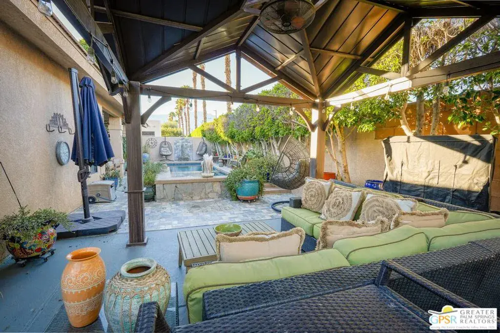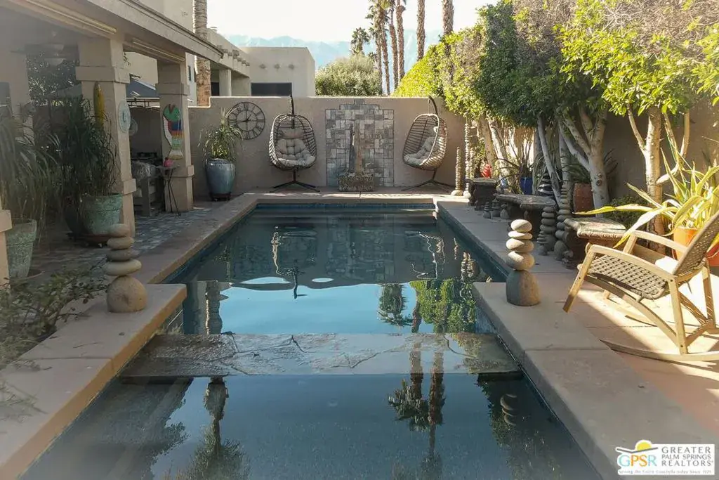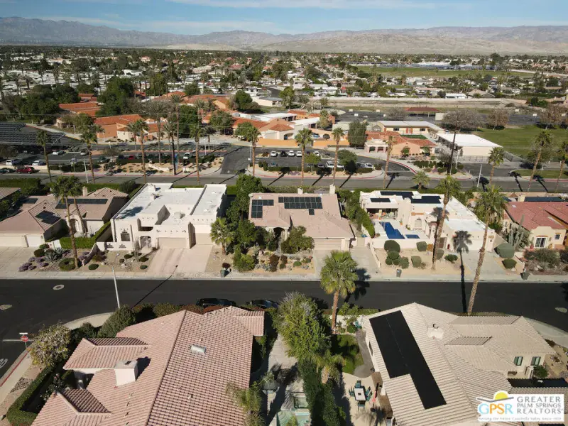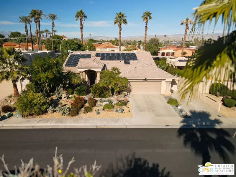 Paradise found. From the moment you arrive, it’s clear this home is something special. The front yard offers a lush, tropical feel thoughtfully designed with desert-friendly, low-maintenance landscaping and features two private seating areas tucked within the garden. Upon entering, you’re immediately drawn through the beautifully appointed great room toward the equally inviting rear yard, passing the open yet surprisingly intimate dining room along the way. Beyond the grand foyer, the great room opens fully, anchored by an upgraded kitchen that is both bold and welcoming an undeniable centerpiece of the home. Designed for serious cooking and entertaining, it features a master range, double ovens, microwave, and abundant counter space, while the generous island offers views of the open living areas and the retreat-style backyard. The breakfast area comfortably accommodates family gatherings yet remains perfect for intimate meals. The living room easily supports large gatherings or cozy seating arrangements, and just off this space is a spacious office/den overlooking the front garden, easily convertible to a third bedroom. The first of two primary bedrooms is well-appointed with a generous walk-in closet, while the larger primary suite is truly grand, comfortably fitting a large bed and offering additional seating to enjoy views of the rear yard. And then there’s the resort-style backyard: an east-west oriented pool and spa perfectly positioned to capture the coveted San Jacinto mountain views, surrounded by multiple inviting environments for relaxing and entertaining. The expansive covered patio provides several seating and dining areas, all set within lush yet thoughtfully desert-appropriate landscaping. Completing the picture, the home features multiple solar installationsone owned and one leasedmaking this exceptional property as cost-effective as it is beautiful. Most system through out have been upgraded and updated.