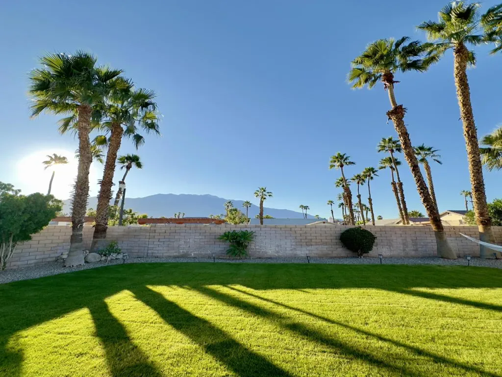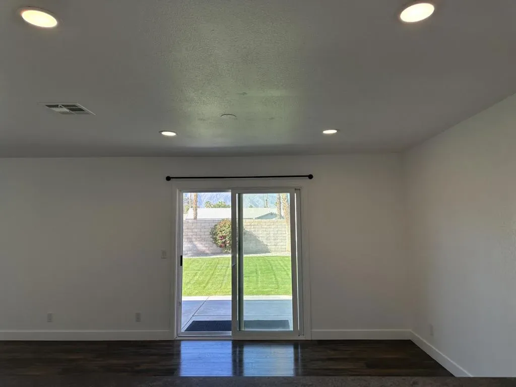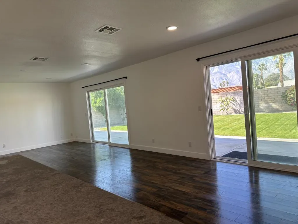 This lovely, updated 3 bedroom, 2 bath home sits on a prime corner lot within the exclusive gated community of Shadow Crest. Step through the double doors into foyer with the guest bedroom entrance to the left and then direct through the archway to find the well designed open floor plan. There is a built in dry bar to the right that leads into the kitchen. The kitchen is open to the dining and living room areas. It features a nice breakfast bar and stainless appliances. Down the hallway you will find a second guest bedroom, guest bath and to the right is the primary bedroom with a large walk in closet and second bath. A few of the upgrades include ceramic tile and pergo flooring, recessed lights, ceiling fans, sliding glass doors and the homes interior has been freshly painted. There is a pantry and utility room off of the kitchen and a door that leads into the garage. The garage is converted and has central AC ducts routed into it, which gives this space unlimited possibilities. The owners used it as an office. The rear yard is lush and features the most magnificent views of the San Jacinto Mountain Range. The community pool/jacuzzi, guest parking and tennis courts are a short walk located in the cul-de-sac directly behind the home. Convenient to all the desert has to offer, including golf courses, shopping restaurants and entertainment There are solar panels on the home that will give you substantial savings on the electric. Included in the rent: HOA, gardener, trash and electric. There will be an annual usage cap on the electric and any overage will be paid for by the tenant.