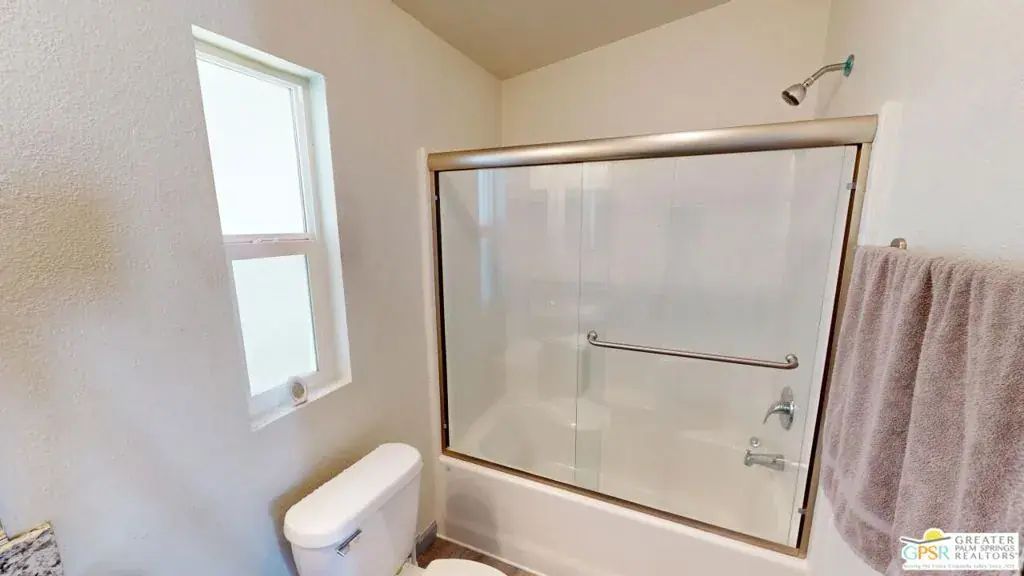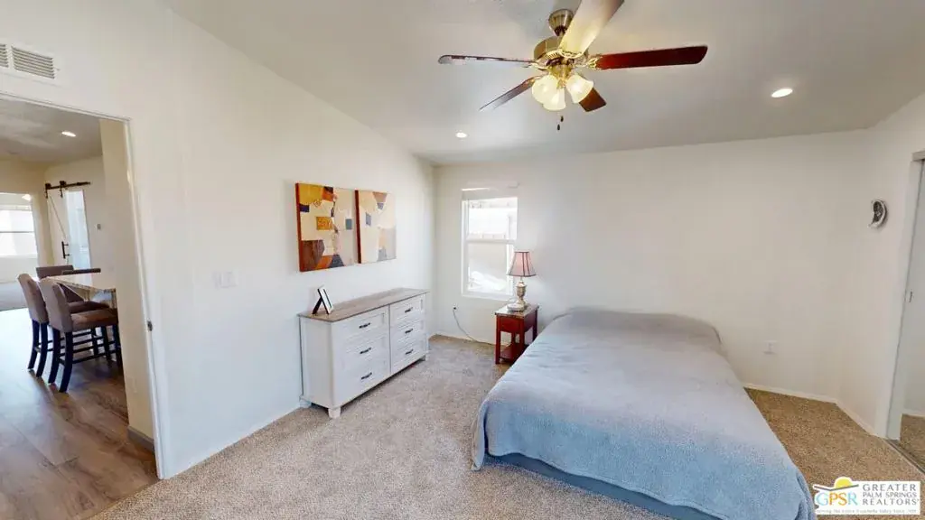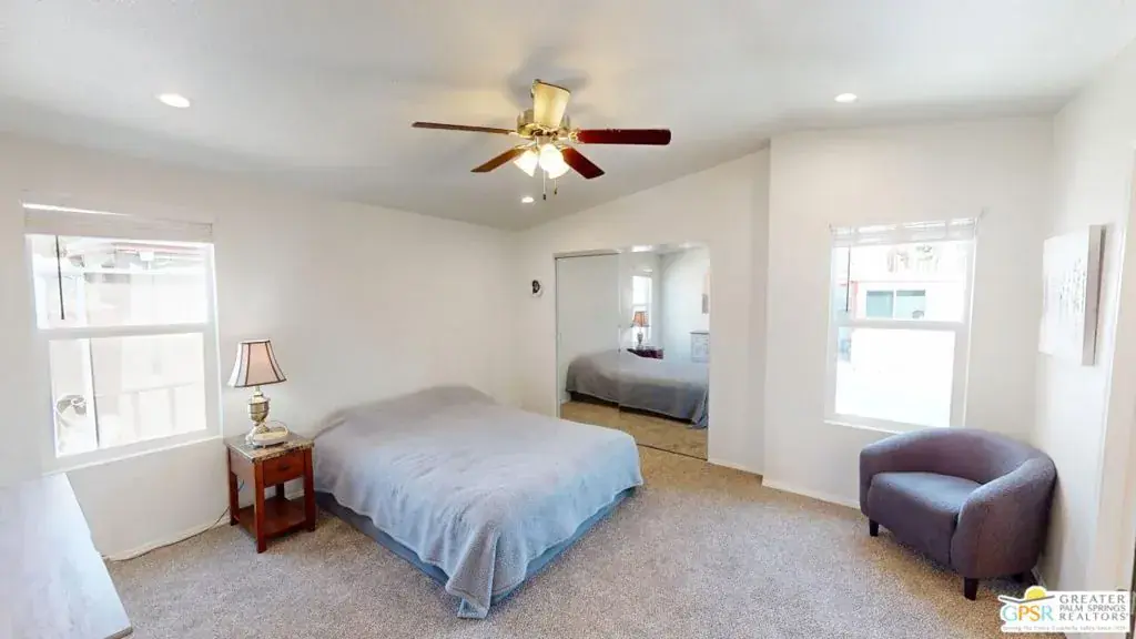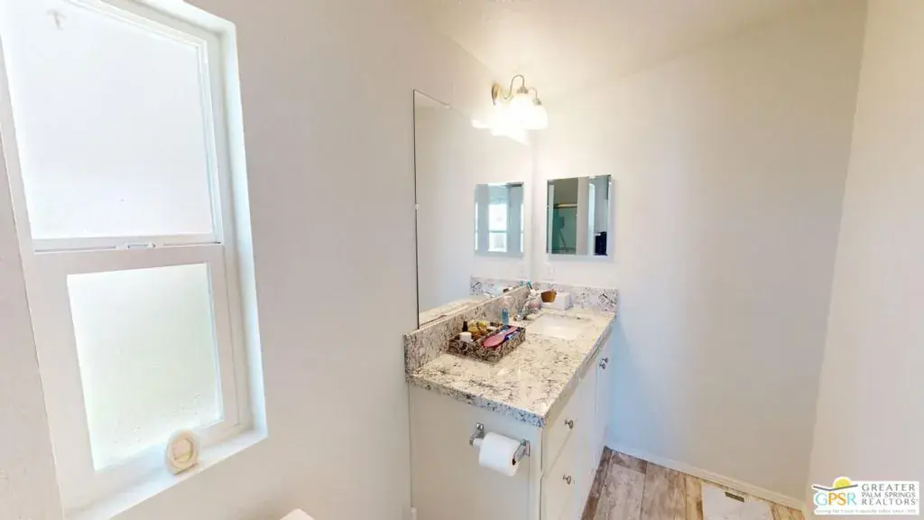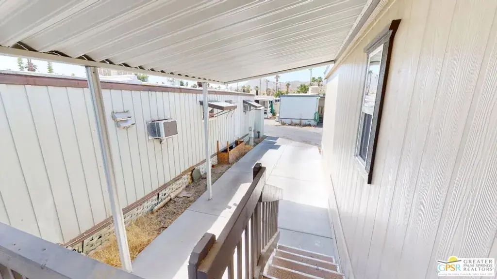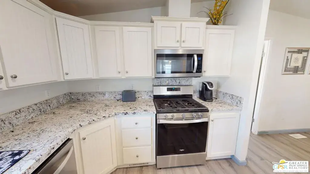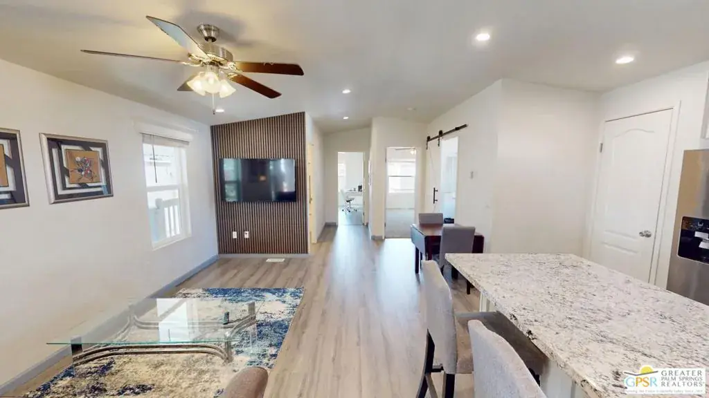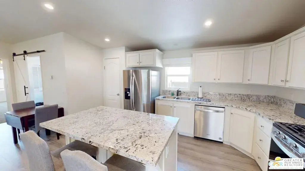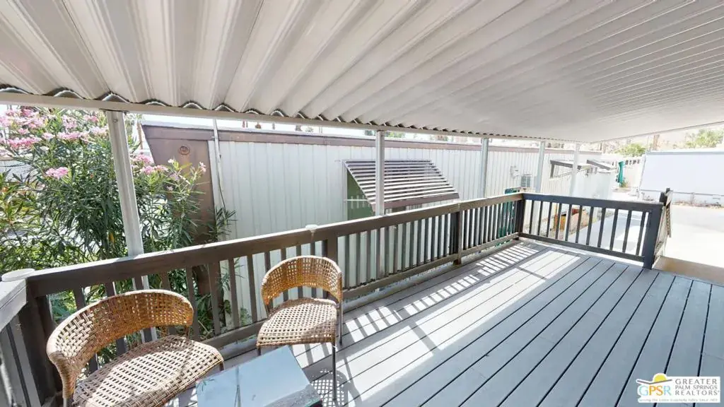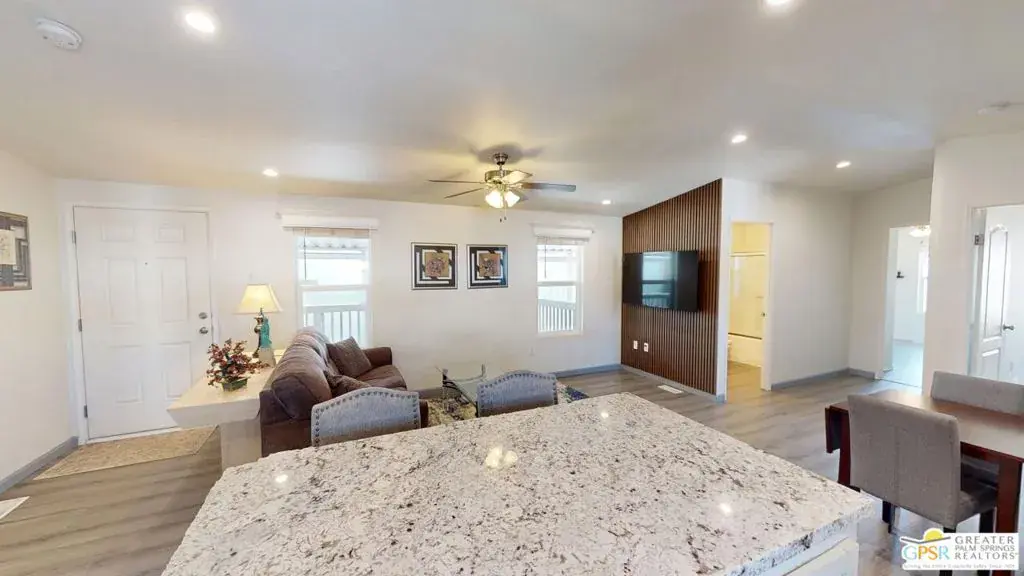 Tramview the 55+ Community! 3 Bedroom 2 Bath Double Width home which was built on 02/25/2022. This terrific home, in Tramview MHC, is situated far from the clamor of Highway 111. Beginning with the huge covered deck/terrace at the front entry and then entering this large 1120 square foot home, it is sure to please. The open concept Living, Dining and Kitchen is a perfect back drop for quiet evenings and also entertaining your family and friends. This floor plan has all of the entertaining – Living, Dining and Kitchen, in the middle of the home which gives great privacy to the primary bedroom that is located at the north end of the home, while the two other bedrooms, are located at the south end. These two bedrooms offer peek-a-boo views of the Santa Rosa Mountains. The open Kitchen with Granite Counters, Granite Island with Breakfast Bar seating, and the beautiful Stainless Steel appliance package is perfect including the side by side refrigerator, gas range and cooktop, microwave oven and dishwasher and double stainless steel sink. Although the home has Central Air-Conditioning, there are also ceiling fans throughout. The vaulted ceilings are accentuated by the new vinyl plank floors in the main living area, while the bedrooms feature updated carpeting.