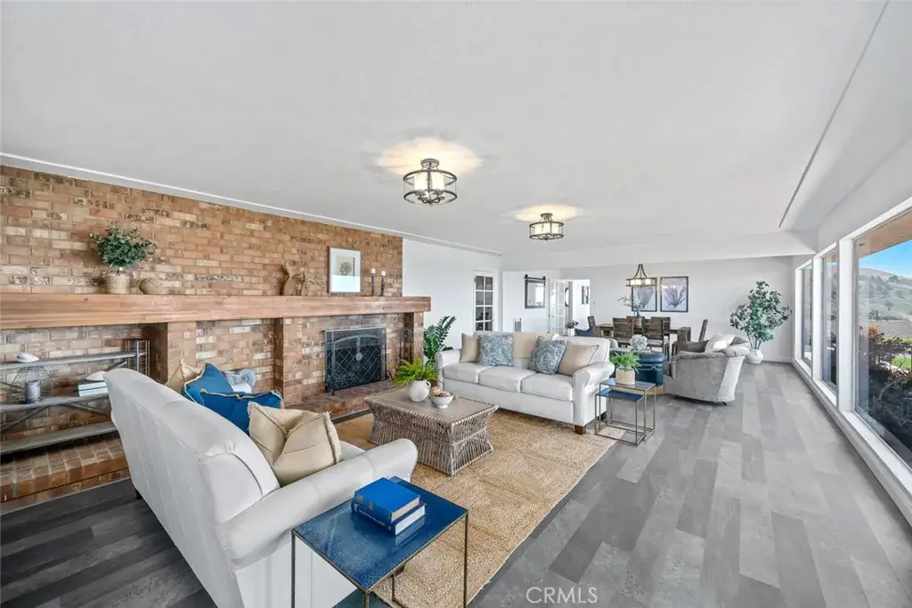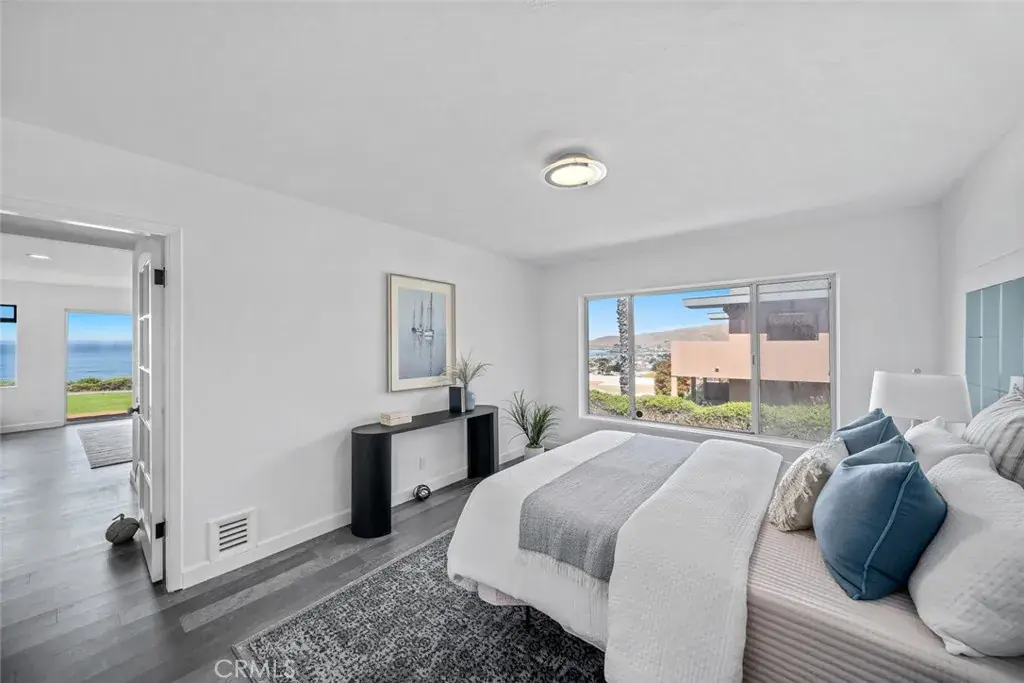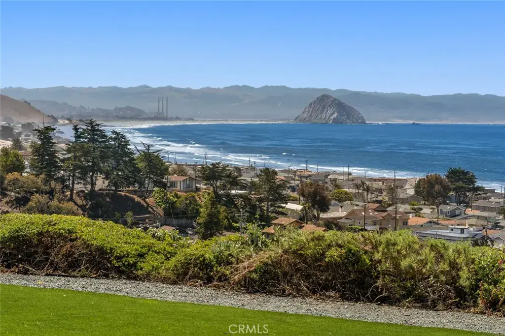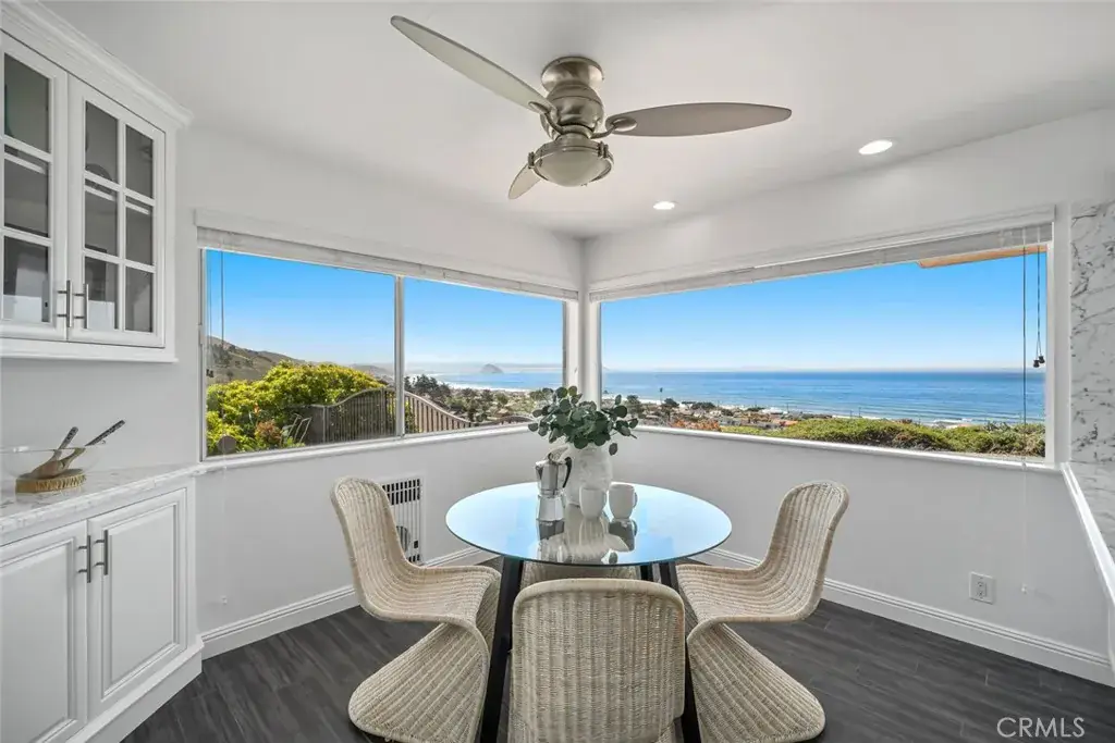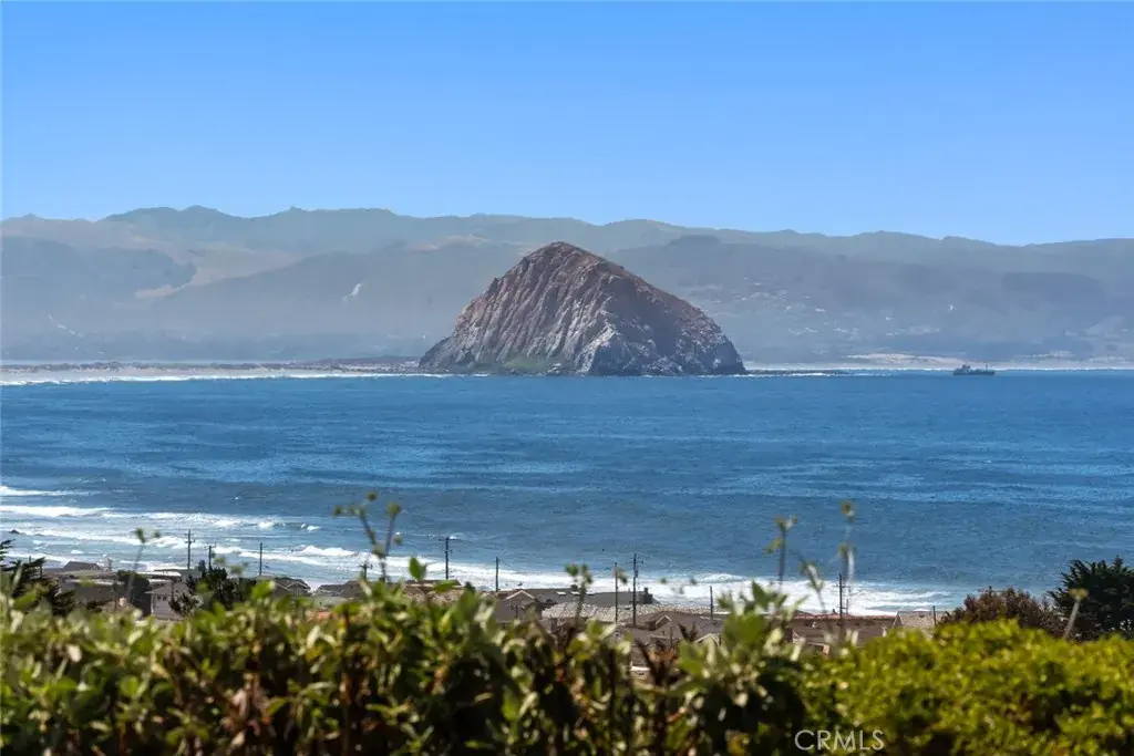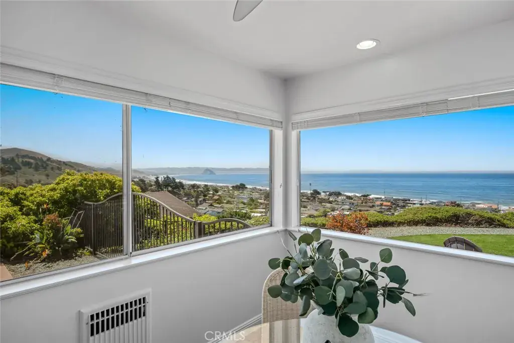 Step inside to a bright and airy layout featuring three bedrooms, three bathrooms, a bonus room, and a home office. The kitchen boasts white cabinetry, marble countertops, a breakfast nook, and picture windows that frame the stunning ocean and Morro Rock views.