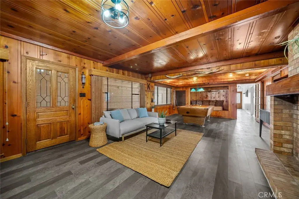 Relax and unwind in the elegant living and dining areas, both showcasing expansive coastal vistas and a cozy wood-burning fireplace. The bonus room adds an element of fun with a bar, pool table, fireplace, and built-in bed nook.