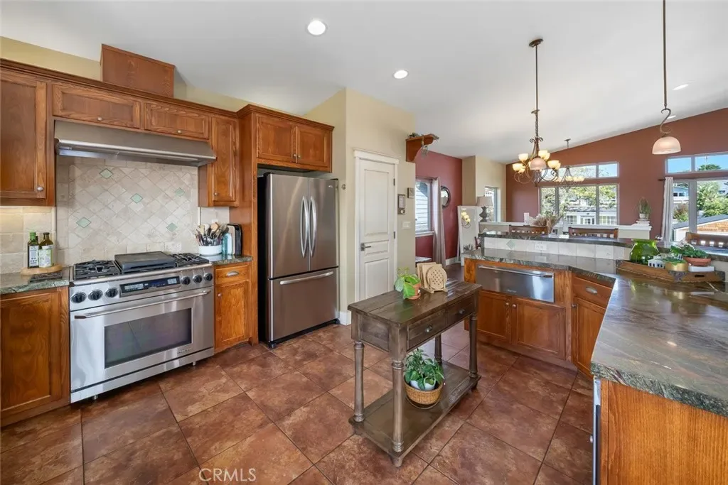 The gourmet kitchen is a chef’s delight with stainless steel appliances, including a 6-burner gas range, range hood, warming drawer, built-in microwave, dishwasher, and refrigerator. Rich cherry wood cabinetry, granite counters, a custom tile backsplash, pantry, and a large center island with seating make it both functional and stylish. A versatile fourth bedroom with double doors—perfect as an office or den—and a powder room complete the upper level.