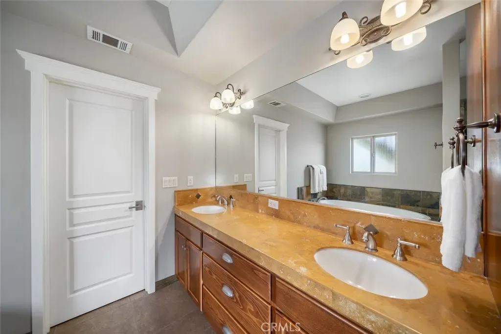 Downstairs, the spacious primary suite features direct access to the courtyard and a luxurious ensuite bath with dual vanities, a soaking tub, walk-in tile shower with dual shower heads, and private toilet room. Two additional bedrooms offer bright, comfortable spaces. A second full bathroom with dual sink vanity serves the second and third bedrooms. A dedicated laundry room with storage and outdoor access, adds convenience and potential after beach excursions.