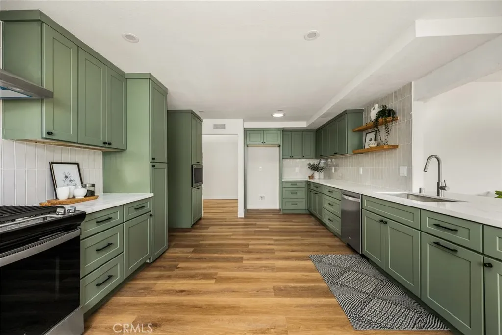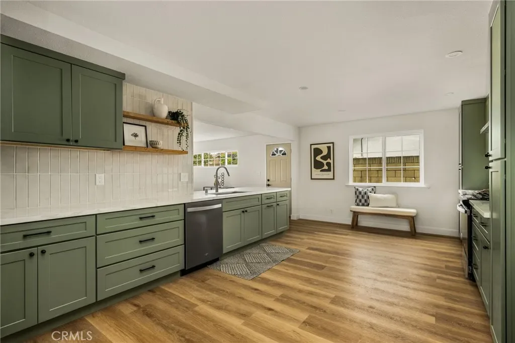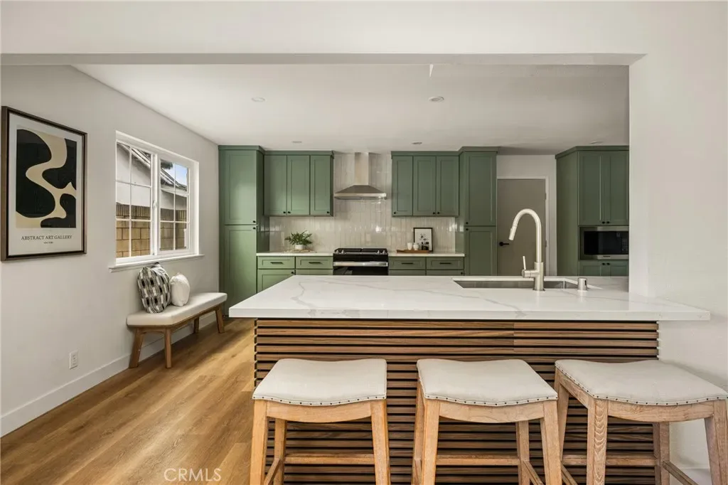 The expansive kitchen is a true centerpiece, featuring new cabinetry, stainless steel appliances, and a generous peninsula with bar seating—perfect for casual breakfasts or entertaining. The kitchen opens seamlessly to an additional family room with ample space for relaxing, TV viewing, and gatherings. Just beyond, the dining area provides room for a large dining table and features sliding doors that lead to the backyard, creating an ideal indoor-outdoor flow.