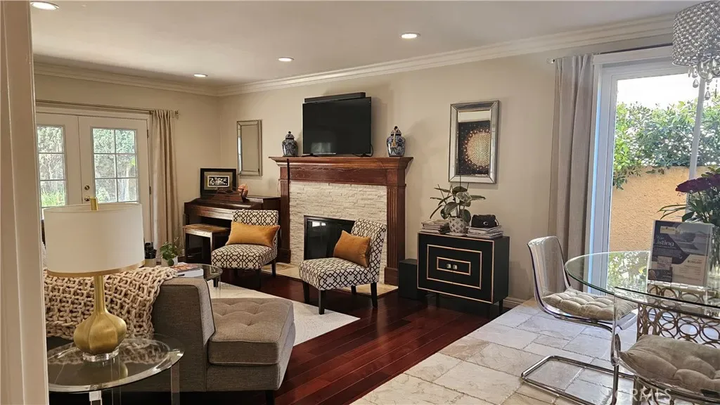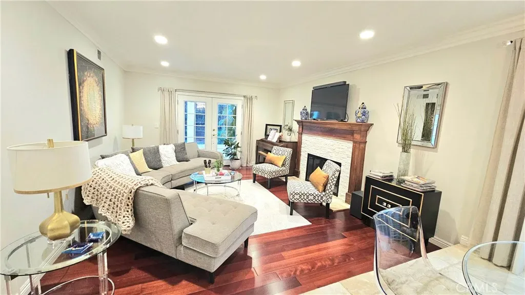 Welcome to this well-maintained property located in the best neighborhood of Cerritos. ABC school district. This property features three bedrooms and two bathrooms, a welcoming front gated Patio for privacy, Light filled living room with hardwood floors and gas fireplace and crown moldings, kitchen was recently remodeled offers grey cabinets, nice backsplash and warming Calacatta quartz countertops, stainless steel appliances including a oven, microwave and gas cooktop with glass hood. The back patio is surrounded with mature trees for privacy.