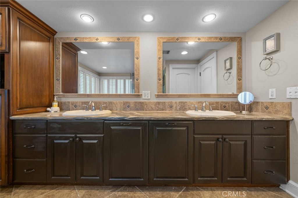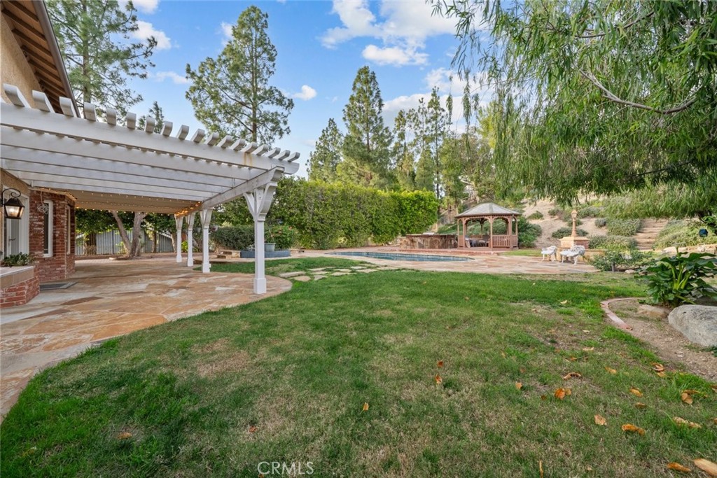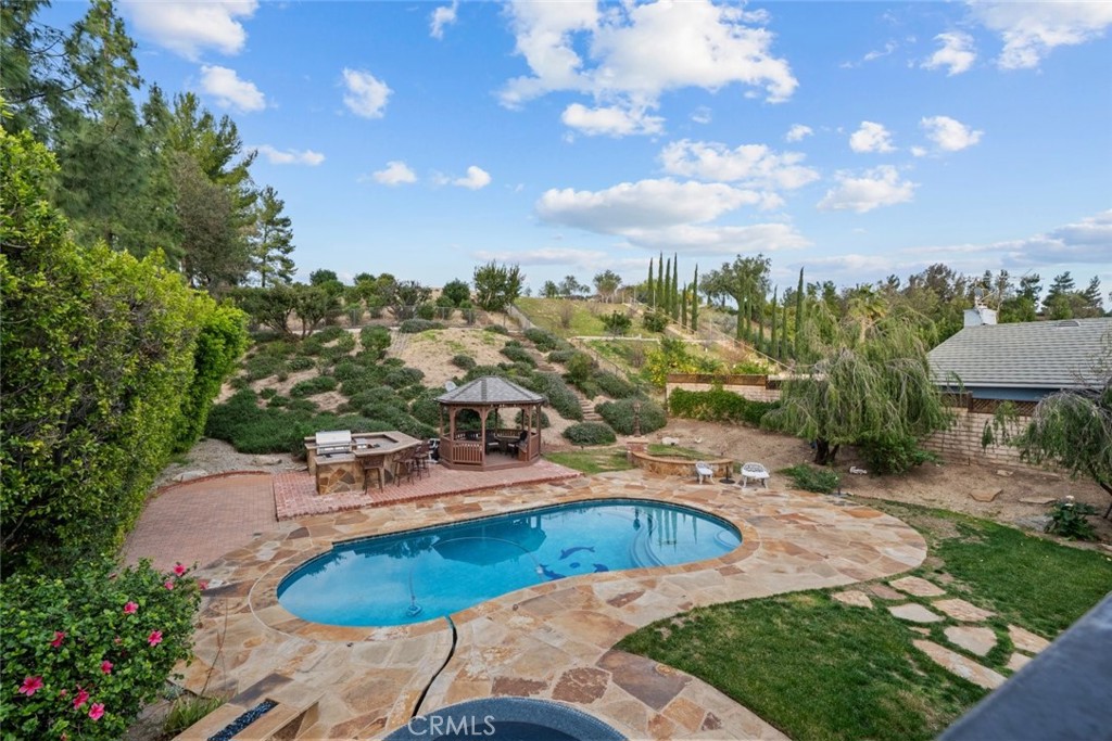 The backyard is designed for both relaxation and hosting, featuring a resort-style pool, raised spa, gazebo, and a large covered patio. The outdoor space is further enhanced by built-in barbecue with fiber optic countertops, creating an inviting ambiance for evening gatherings. Mature landscaping and generous open areas offer endless possibilities for customization.