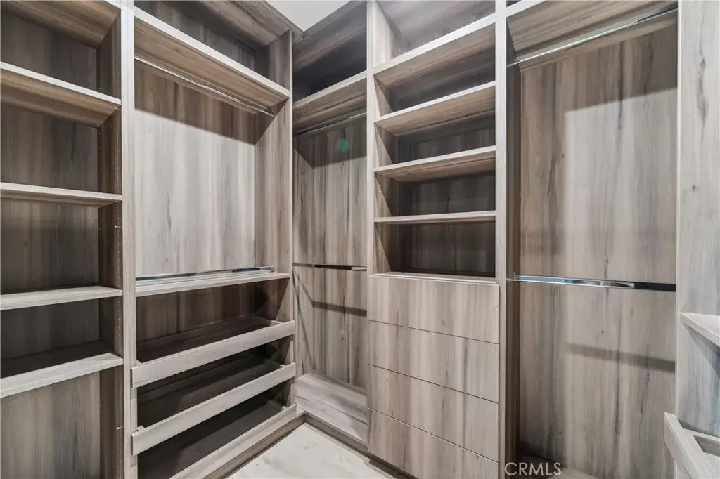 The primary bedroom includes a walk-in closet and spa-inspired bath with aromatherapy steam shower and smart bidet. Bathrooms are individually designed, including one with a jacuzzi tub and another with dual indoor-outdoor access, ideal for pool use. The backyard offers a resort-style pool with waterfall, lush landscaping, built-in speakers, room for an ADU, and gated rear access. Additional highlights include new plumbing, electrical, HVAC, whole-home water filtration, integrated sound system, security cameras, and an oversized garage with custom cabinetry and loft storage.