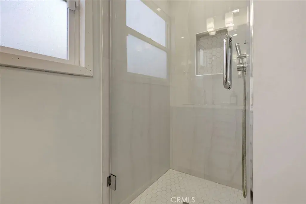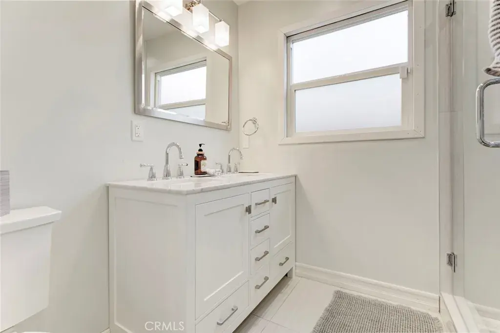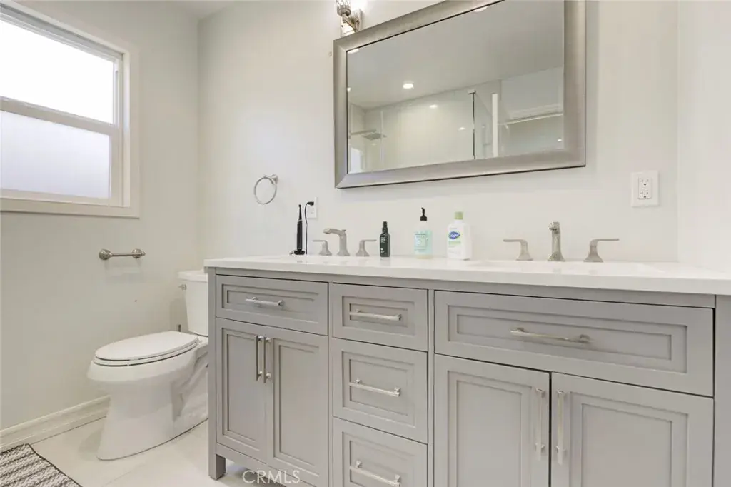 The stunning kitchen is a true centerpiece, showcasing a spacious quartz island with bar seating, abundant storage, semi-gloss cabinetry, quartz countertops, and a newly installed stainless-steel hood. Bathrooms have been thoughtfully upgraded, including a remodeled guest bath with dual sinks and a spacious primary bathroom highlighted by a custom walk-in shower with built-in bench, all designed by the current homeowner.