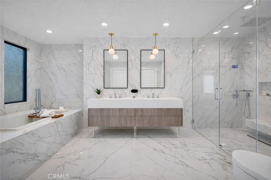 Spacious bedrooms provide comfort and flexibility, including a luxurious primary suite retreat designed as a private escape with a spa-inspired bathroom featuring dual vanities, premium stone finishes, soaking tub, and oversized walk-in shower. Large windows throughout the home enhance the warm contemporary design while bringing in abundant natural light, creating a bright and inviting atmosphere across all living spaces.