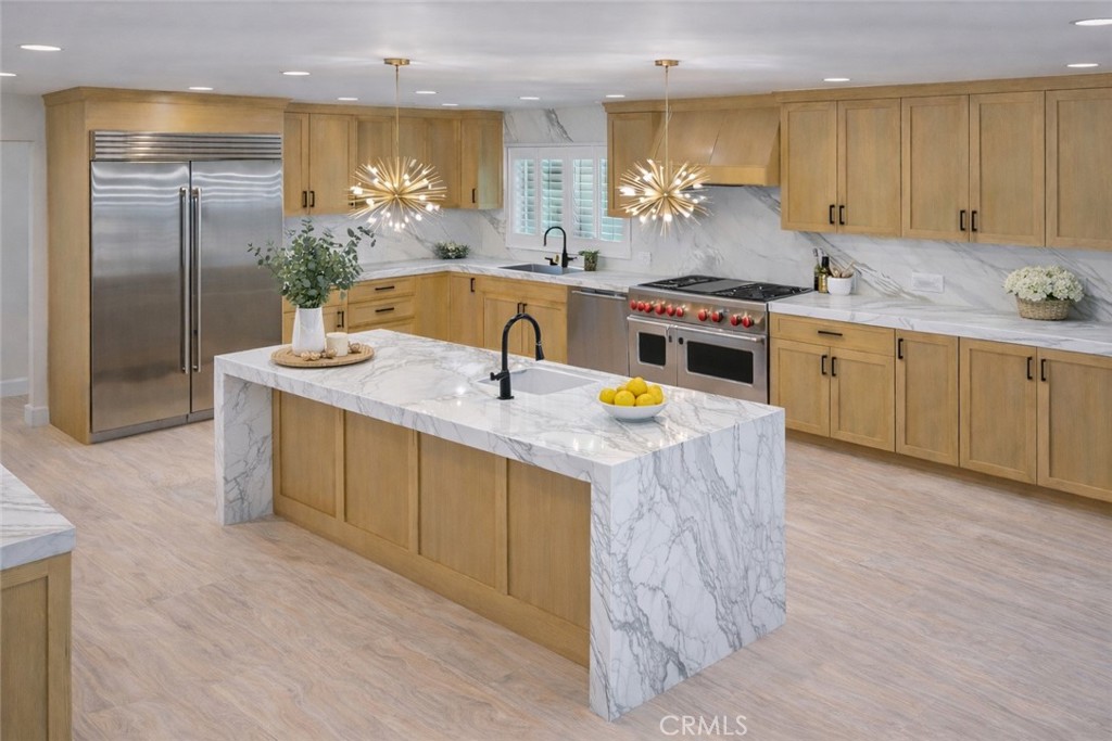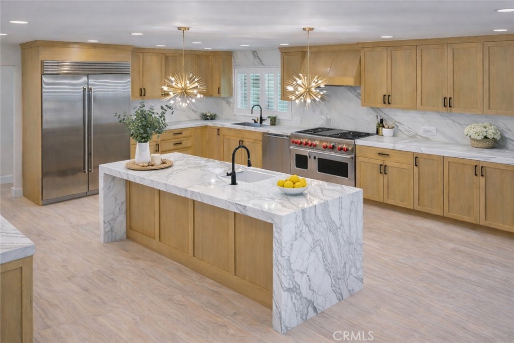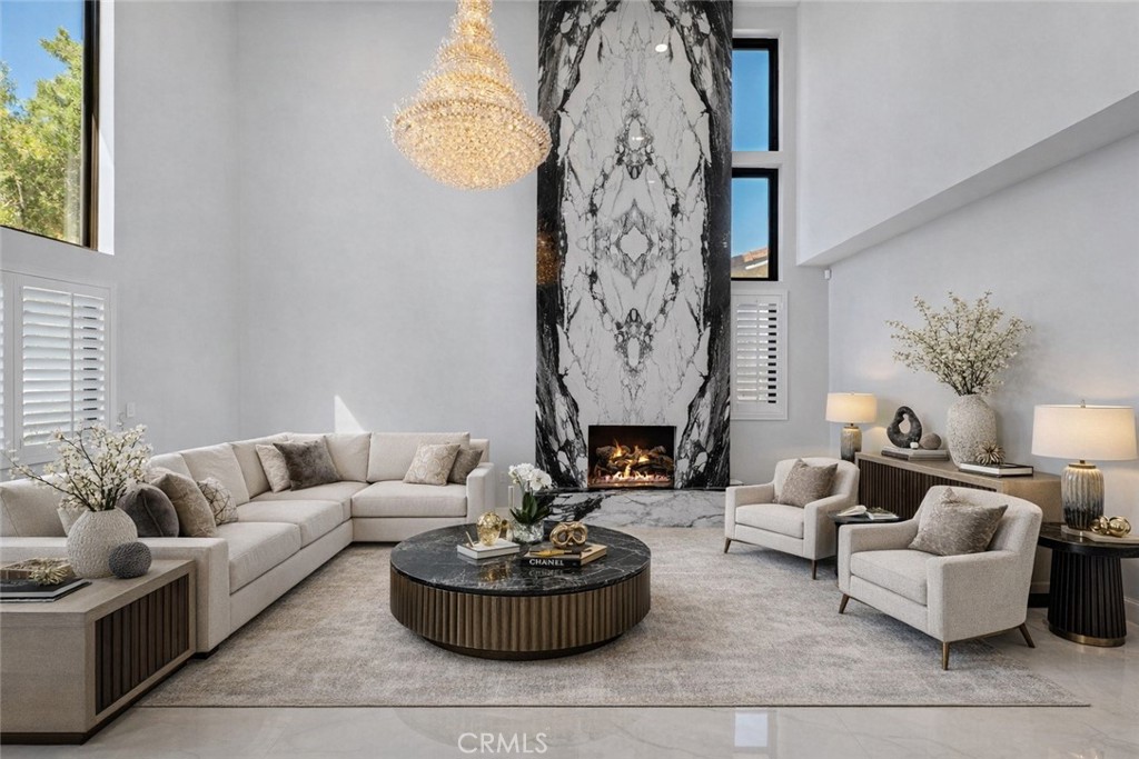 The thoughtfully designed layout features a highly desirable open concept floor plan with a dramatic living room, statement fireplace wall, spacious family room, and elegant dining area filled with natural light from large windows and tall ceilings. At the heart of the home is the chef’s kitchen, featuring custom wood cabinetry, high-end stainless steel appliances, professional gas range with signature red knobs, marble countertops and backsplash, and a large waterfall island with seating, making it the perfect gathering space for cooking, hosting, and everyday living.
