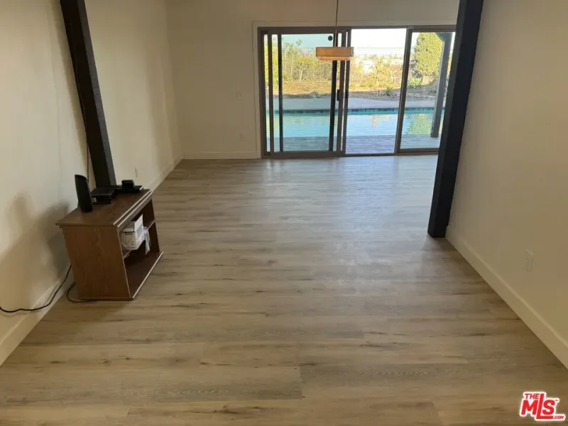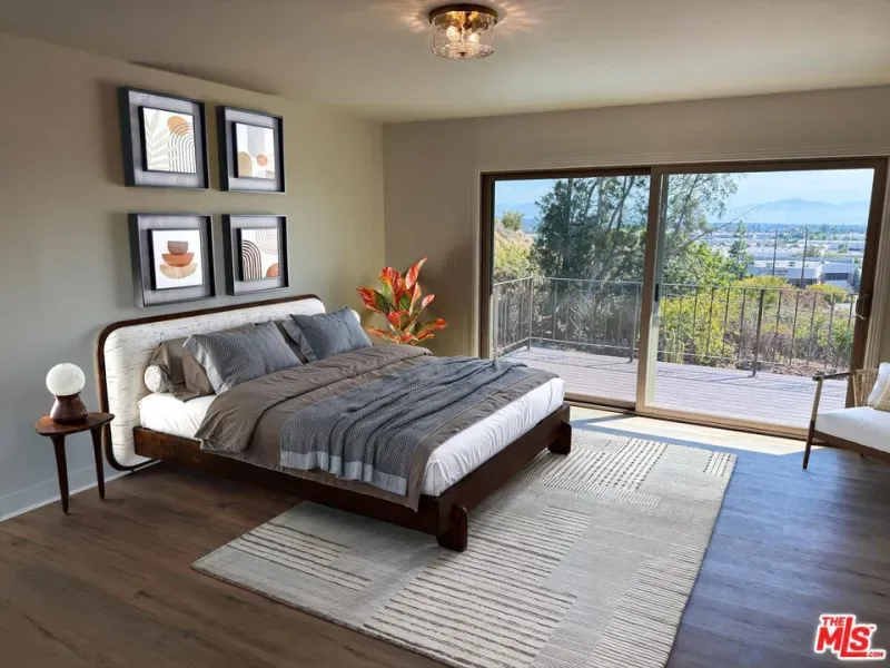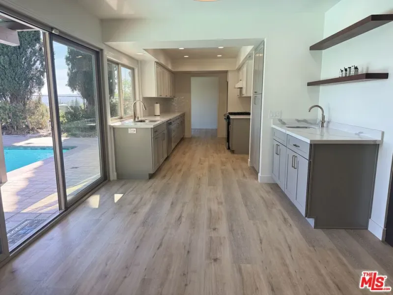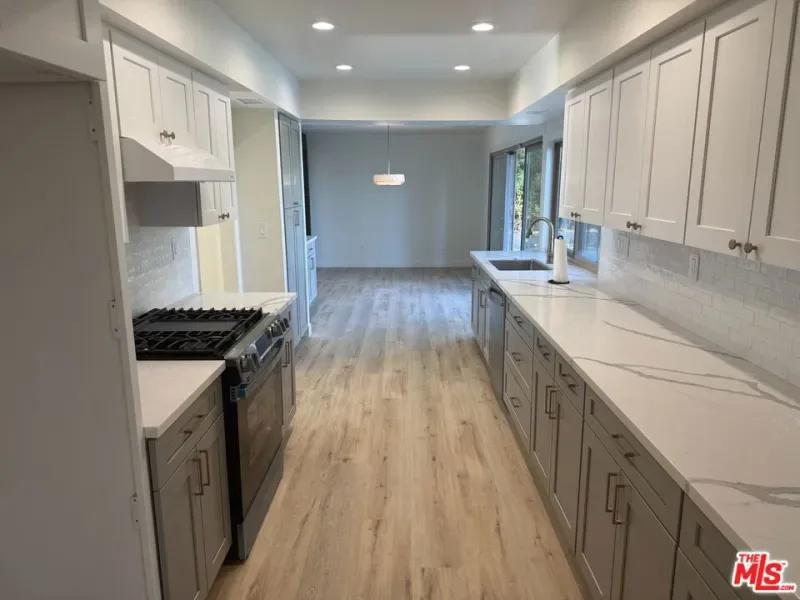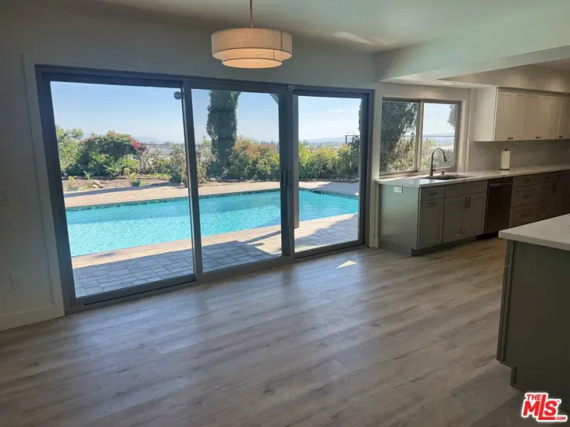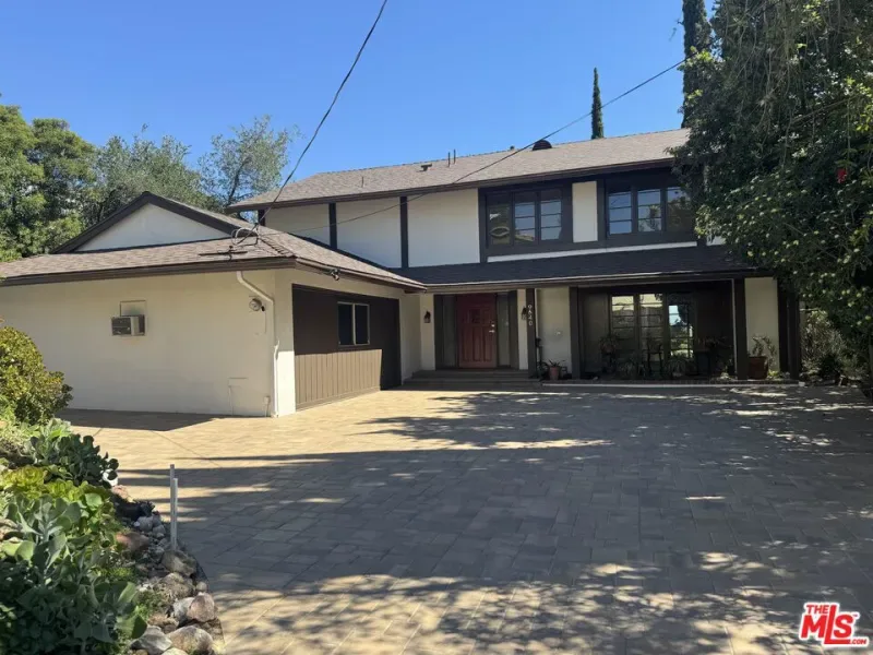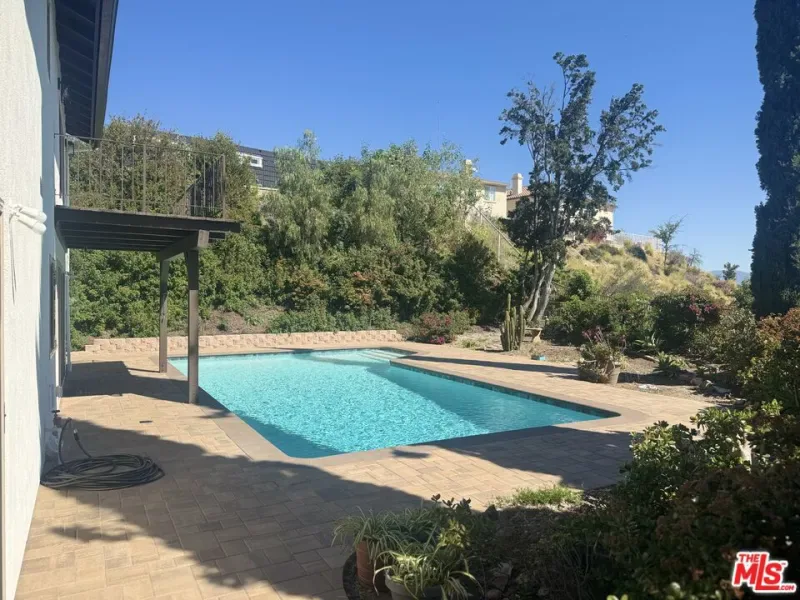 Perched above Chatsworth on a private 13,249 sq ft flag lot, this freshly renovated 4-bedroom, 2.5-bath home offers panoramic views of the San Fernando Valley. The 2,211 sq ft layout has been thoughtfully updated in 2025 with major system improvements including a new roof, HVAC, and a brand-new main sewer line to the city connection; interior renovations featuring a modern galley-style kitchen and updated bathrooms; exterior upgrades such as a new driveway and patio pavers; and outdoor enhancements including a resurfaced pool. The entry level offers a welcoming living room with fireplace, a dining area, and a breakfast nook adjoining the galley-style kitchen with ample cabinet space. A convenient 3/4 bathroom serves the downstairs. Two sets of large sliding glass doors open to the private spacious backyard, where a resurfaced pool, new equipment, paver patios, and easterly views create an ideal setting for outdoor living and entertaining. The primary bedroom includes a private patio with sweeping views, an ensuite bath with vanity, and dual closets. Three additional bedrooms share a full bathroom, providing comfortable accommodations for family or guests. An attached garage, previously converted into a den, workshop, and laundry area, offers additional usable space but has not been part of the recent renovations presenting flexibility for future customization. With its elevated hillside setting, modern upgrades, and unique flag-lot privacy, this Chatsworth home blends comfort, functionality, and breathtaking views into one rare offering.