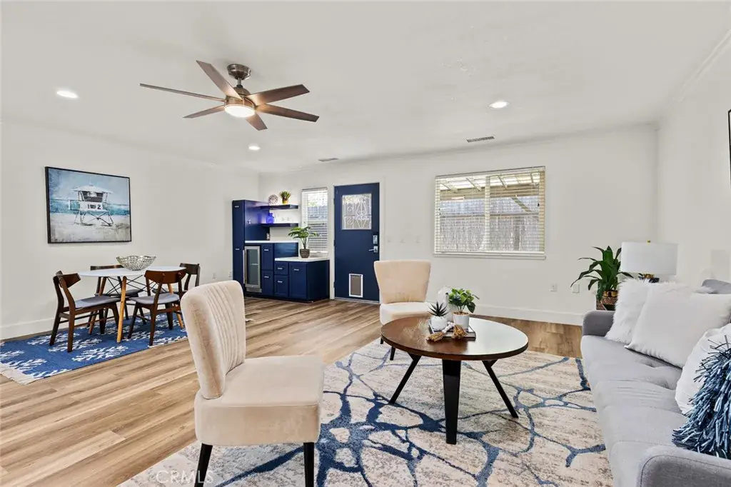 There was also an added dry bar in the dining room area complete with beverage refrigerator and storage! The primary bedroom is HUGE and separate from the other 2 bedrooms!! It has an electric wall fireplace, walk in closet and remodeled bathroom with new counter, walk in shower and flooring!