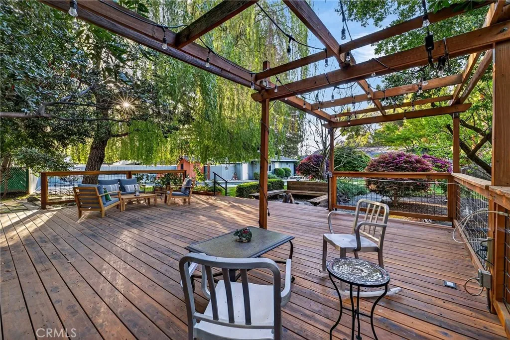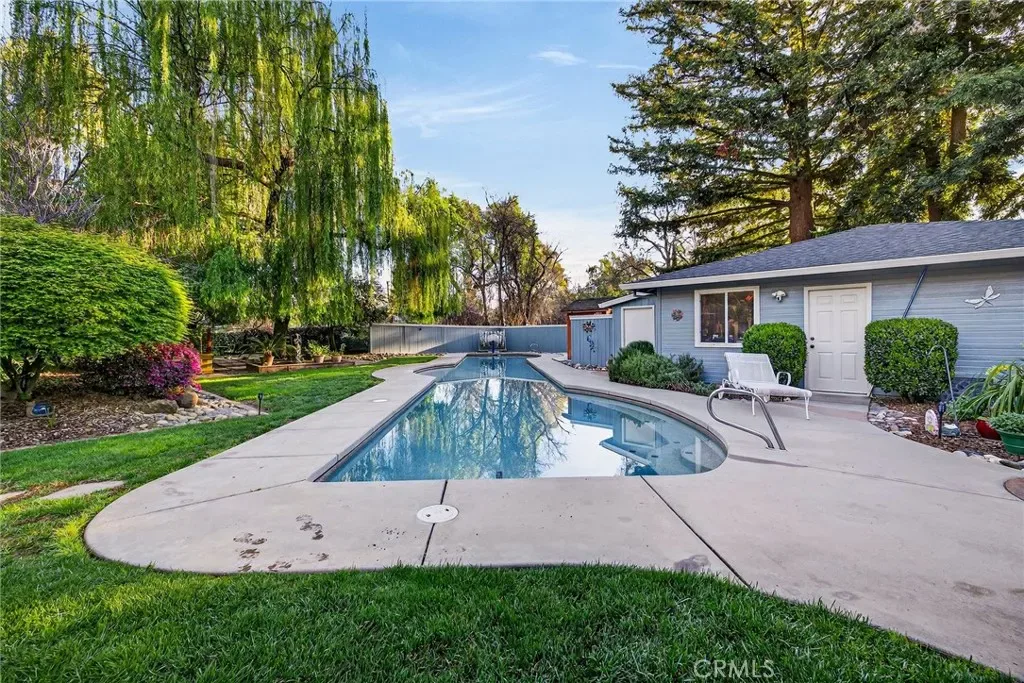Seller offering a $10,000 closing credit to buy down interest rates. Large House, lot, 75 foot full-length lap POOL with swim-outs. This 3284 square foot custom house is TURN KEY and REMODELED with a leathered granite chef’s kitchen .72 acre CREEK FRONT parcel in a premium established neighborhood. RV and BOAT PARKING, detached 2 car GARAGE with SHOP, shed and sauna. Private and fully landscaped yet walking distance from downtown restaurants, galleries, year-round Farmer’s Market and Chico State University. House has 2 wings offering a perfect in-law floor plan. A MASSIVE PRIMARY SUITE on one-side has its own sitting area, walk-in closet with built-ins, several other closets, coffered ceilings, skylights and a lush secluded patio. It also has a sunny little office or perhaps Nursery/play room just off the primary suite. On the other side of the home you will find a second living room/family room, a lovely guestroom and another primary bedroom with ensuite bathroom. This primary has a door to the pool and sauna. The formal dining room has views of the beautiful lawn and fig trees. The spacious open great room has multiple sitting areas and a cozy gas fireplace, newer LVT floors and views of the pool, weeping willow and fruit trees in the big back yard. A beautiful redwood deck over-looks Big Chico Creek, firepit, multiple covered patios and porches. Freshly poured concrete driveway with several parking areas. Fresh exterior paint. Owned solar array is older but PG&E bills are still very reasonable. Whole house fan adds to efficiency. New 50 year roof in 2018. 16 skylights make this home glow with natural light. Rich loamy soils in the area have put several of the neighboring homes on the Chico Rose Garden tour. A stroll through the orchards to the West leads to Rose Bridge and scenic Bidwell Avenue.