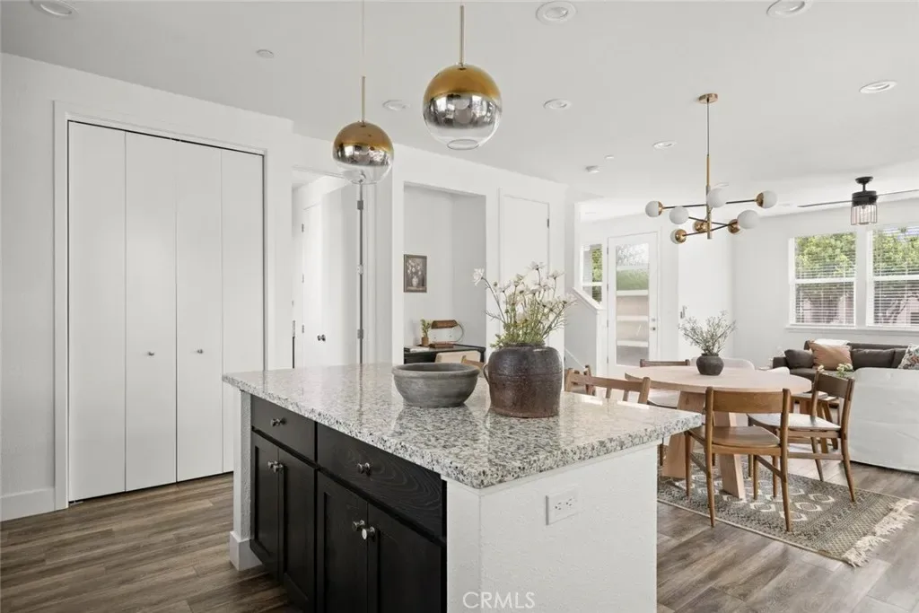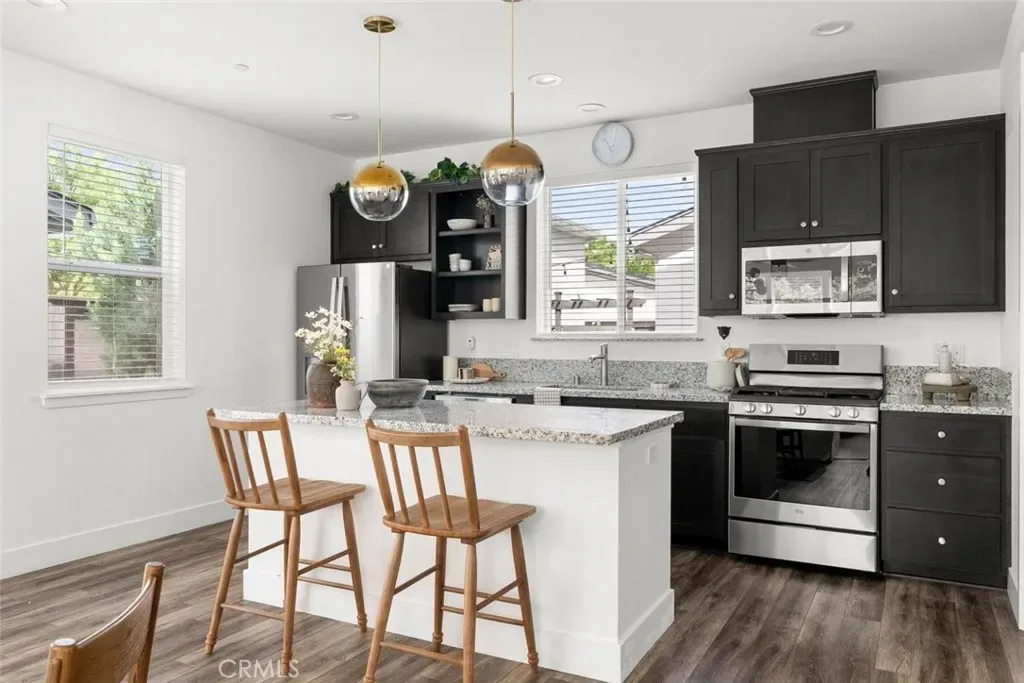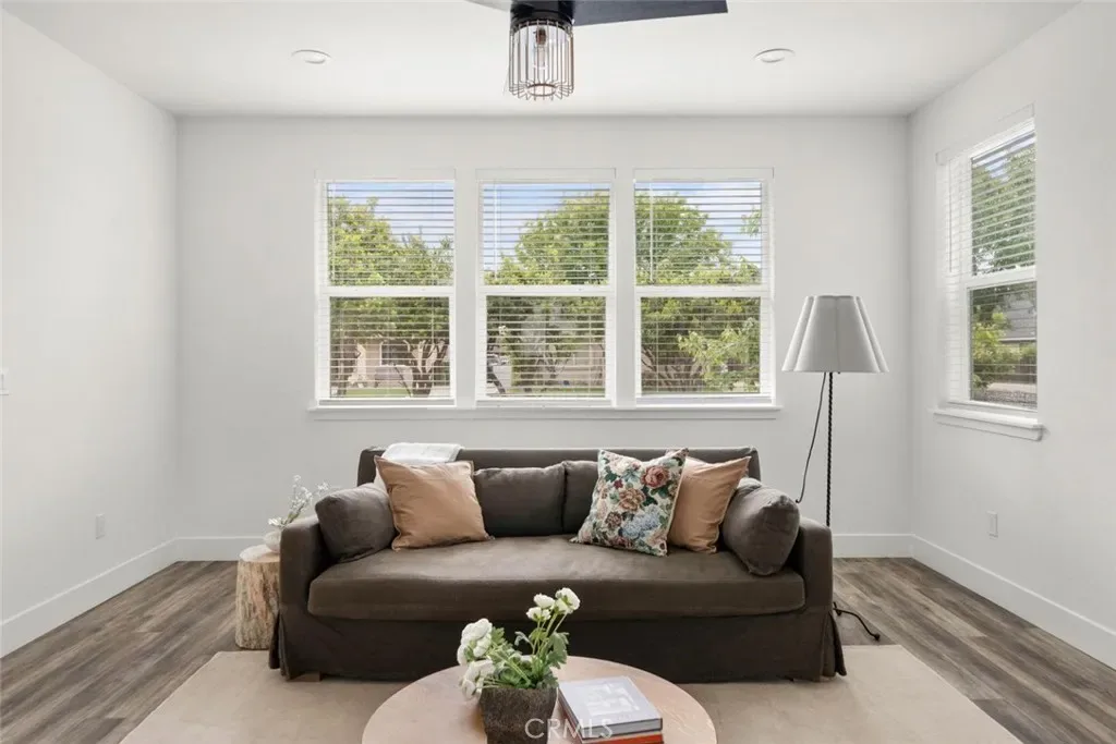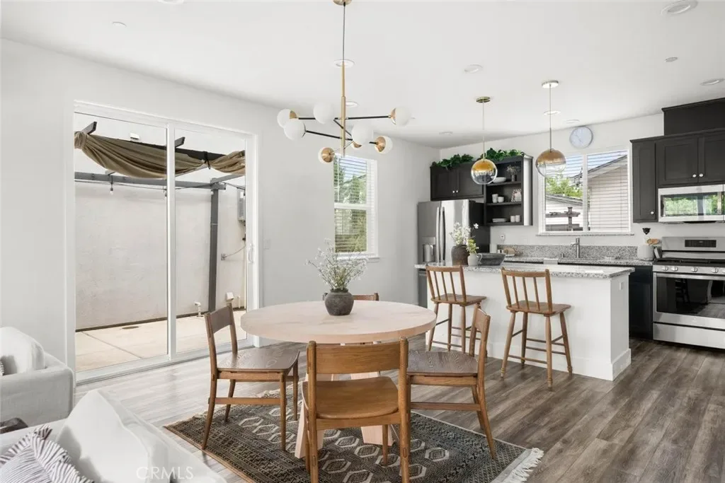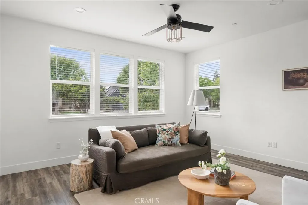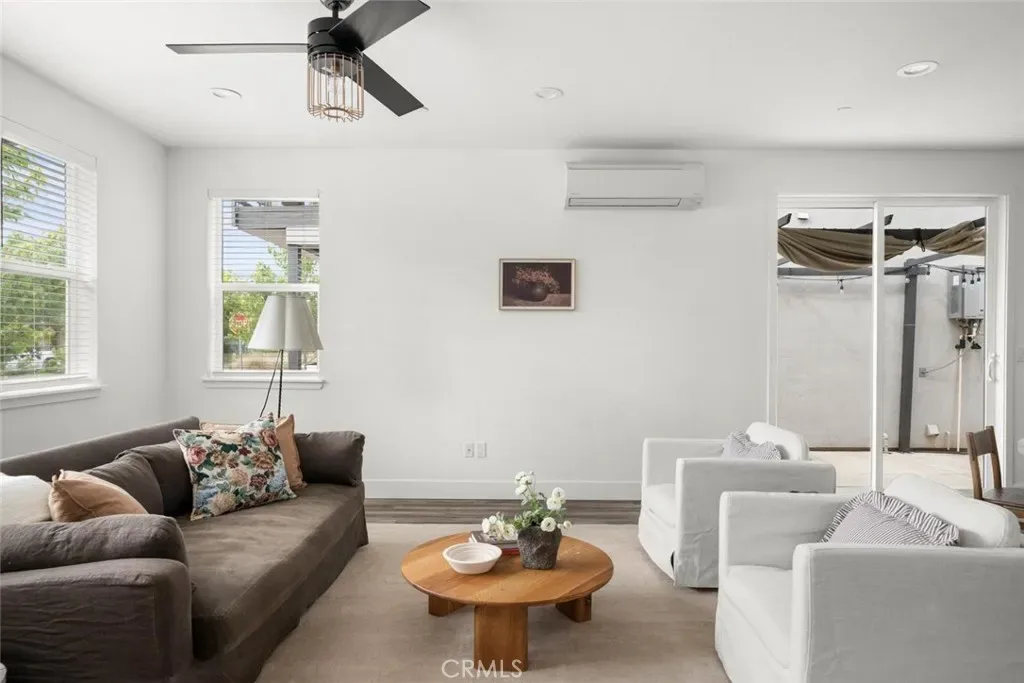 Contemporary 3-bedroom, 2.5-bathroom home in Meriam Park, minutes from Bidwell Park, Meriam Park’s retail and dining corridor, and downtown Chico. This open-concept, two-story home features lightly painted walls, recessed lighting, ceiling fans throughout, and mini-split systems for room-by-room climate control. The kitchen includes granite countertops, wood cabinetry, stainless steel appliances, a gas range, and a center island with breakfast bar seating, open to the main living area. Upstairs, the primary suite offers a walk-in closet, private balcony, and en suite bathroom with dual sinks and a walk-in shower. Two additional guest bedrooms share a full bath and provide flexible space for family, guests, or a home office. The detached two-car garage includes extra storage, and the back patio offers dedicated outdoor space for entertaining or relaxing.