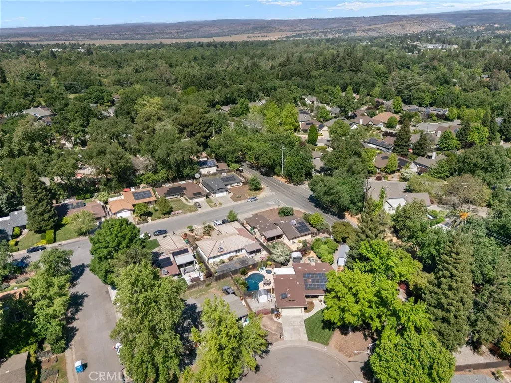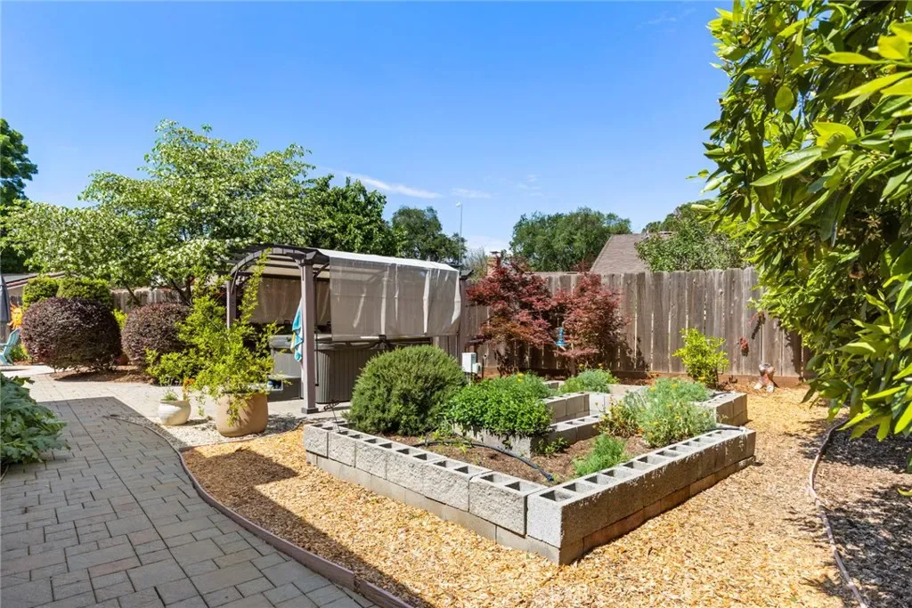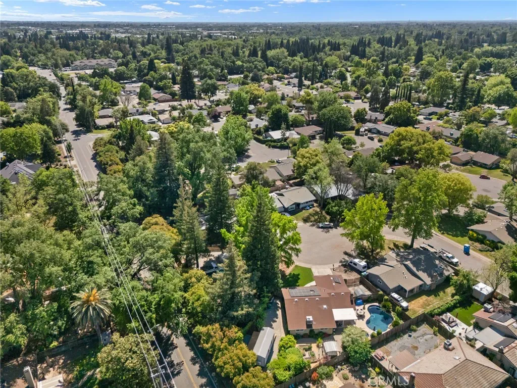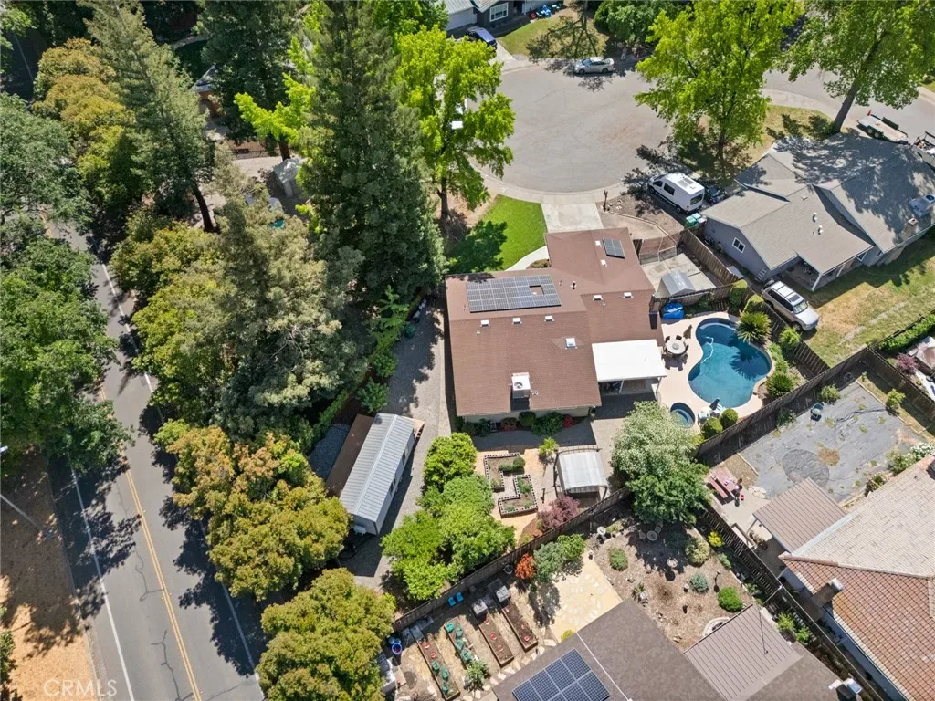 Welcome to 2 Vermillion Circle—an exceptional Chico property tucked at the end of a quiet cul-de-sac, just blocks from the trails, open space, and lifestyle of Lower Bidwell Park. With thoughtful upgrades throughout and incredible outdoor amenities, this home offers the perfect blend of comfort and efficiency. Inside, the home has been beautifully updated with luxury vinyl plank flooring and a spacious, functional layout featuring separate living and family rooms. The remodeled kitchen is a true centerpiece, complete with quartz countertops, a butcher block island, stainless steel appliances, a 5-burner gas range, farmhouse sink, and convenient eating bar—ideal for both everyday living and entertaining. The living room offers a cozy fireplace, and dual-pane windows are found throughout the home. Energy efficiency and comfort are front and center, with owned solar, a newer HVAC system (approximately 2 years old), dual-pane windows, whole house fan, and an on-demand hot water heater—all working together to keep utility costs down and comfort levels high. Step outside to a truly special backyard designed for relaxation and enjoyment. The park-like setting includes an in-ground swimming pool, hot tub, raised garden beds, patios & pavers, and a variety of mature fruit trees (full list available). A detached “tiny home” with its own mini-split system and half bath—currently used as a home office—offers incredible flexibility for a guest space, art studio, workout room, or private retreat (not included in square footage).Additional highlights include RV parking and access, updated bathrooms with beautiful tile work, a stunning tiled walk-in shower in the primary suite, and ceiling fans in all bedrooms.Located with convenient access to the freeway, shopping, and restaurants—yet just moments from one of Chico’s most beloved outdoor destinations—this property truly has it all.