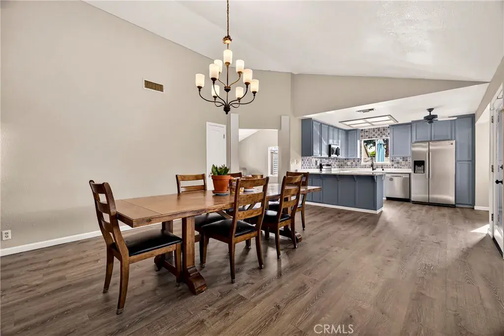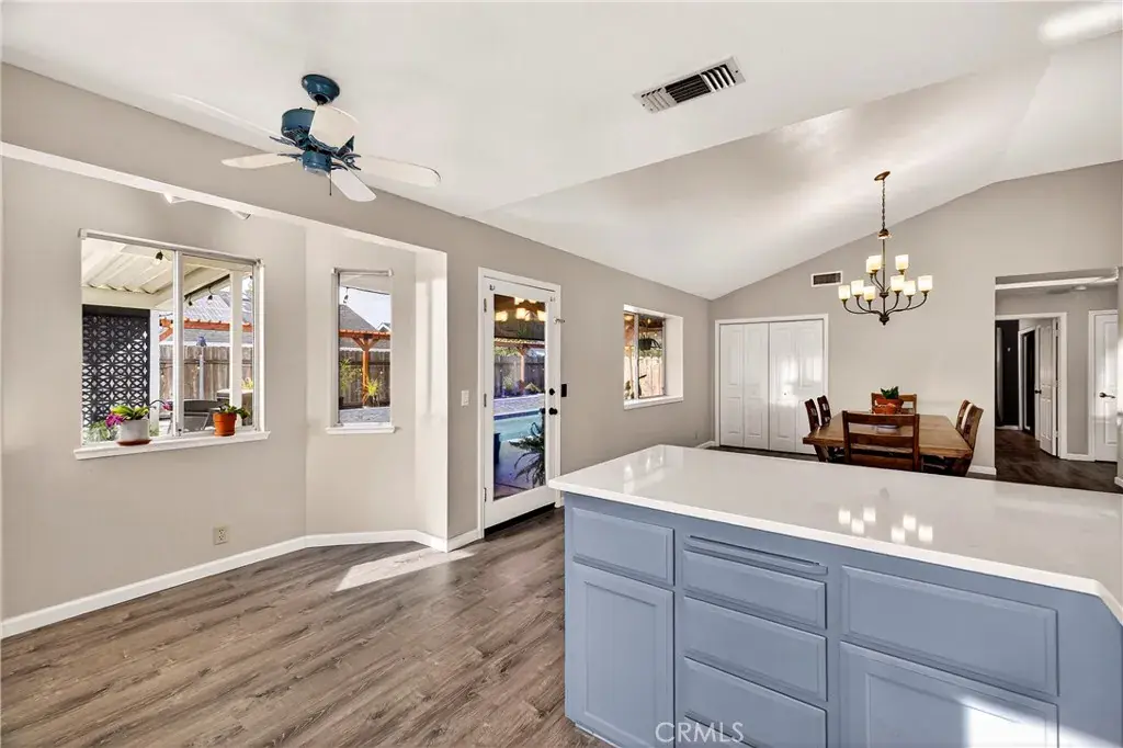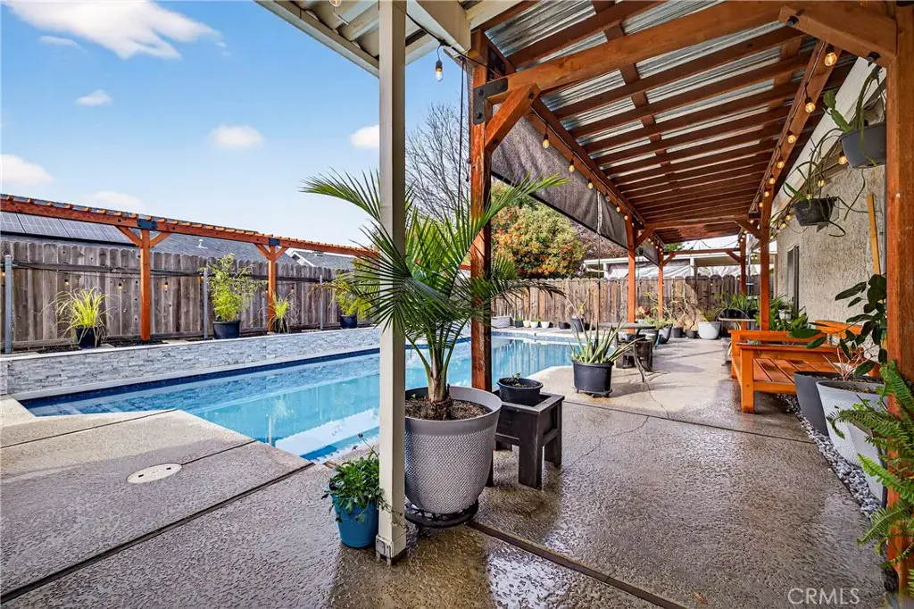 Inside, you’ll find comfort and modern luxury with a new high-end Lennox central heat and air system and 2025 luxury plank flooring throughout. The upgraded kitchen showcases Cambria Quartz countertops, a beautiful tiled backsplash, Samsung stainless steel appliances, freshly painted cabinets, a deep 10″ farm sink, and a cozy bay window breakfast nook. The 6-foot eating bar provides additional space for dining or entertaining. The spacious living room impresses with vaulted ceilings, recessed lighting, plantation shutters, and a new ceiling fan/light fixture. Off the kitchen, an additional living or dining area offers vaulted ceilings, a pantry closet, and glass door access to the backyard retreat. The primary suite features vaulted ceilings, a slider to the backyard, and mirrored closets. The primary bathroom includes dual sinks, a solid surface countertop, a new toilet, and a sleek step-in shower with glass doors. The guest bathroom has been upgraded with a luxurious 17″ deep soaking tub, Carrara marble tile walls, glass enclosure, and a new toilet. The backyard is an entertainer’s dream, featuring the resurfaced Pebble Tech pool, granite and marble ledger stone accent wall, and large 30-ft covered pergola with roll-down sunshades. A second covered patio adds 170 sq. ft. of shaded relaxation space. On the south side, a cross-fenced garden area with raised garden beds. Currently growing are a lemon, orange, lime, and tangerine trees which takes full advantage of the beautiful southern sun—perfect for homegrown enjoyment! This property truly blends energy efficiency, style, and resort-quality living—your personal paradise awaits!