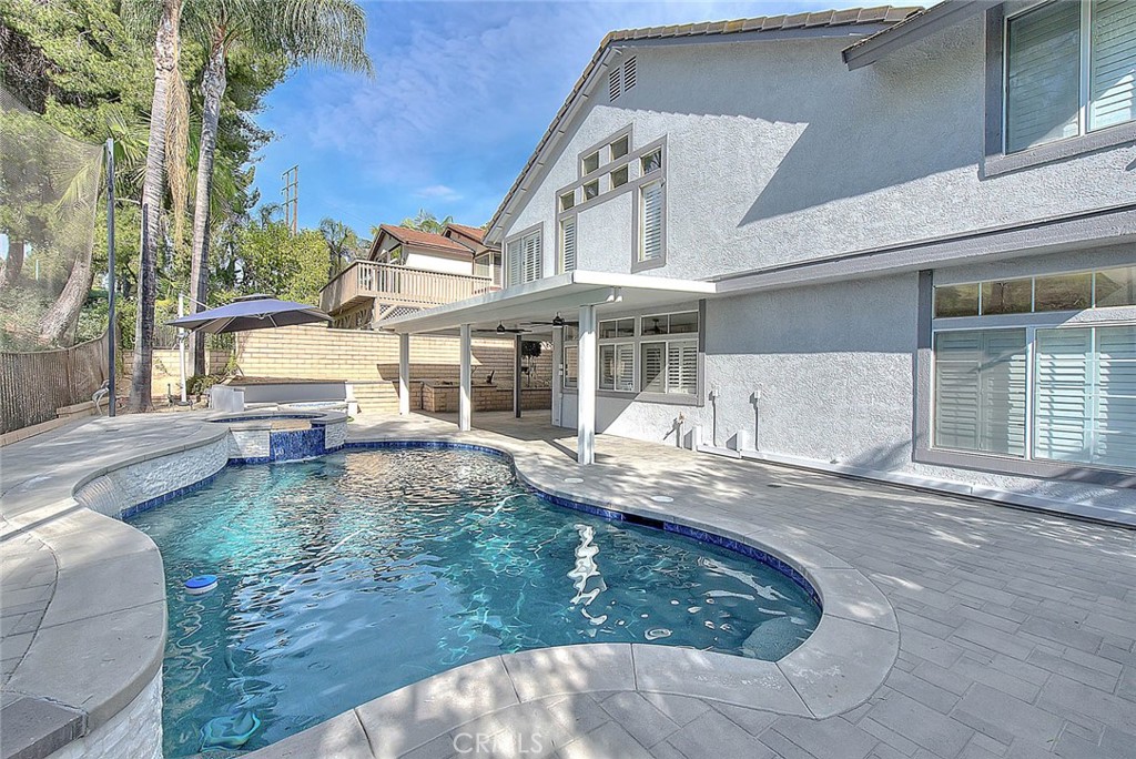 Located in the cul-de-sac of a highly sought-after North Chino Hills neighborhood, this spacious two-story home offers 5 bedrooms, 3 bathrooms, and a large bonus loft. The formal living and dining rooms provide an inviting setting for entertaining, enhanced by high ceilings and abundant natural light. The dine-in kitchen offers generous cabinet and counter space, and the family room—centered around a warm brick fireplace and complemented by a wet bar—creates the perfect space for relaxing. The main floor includes one bedroom, a full bathroom, and a dedicated laundry room. Upstairs, the primary suite features a dual-sink vanity, soaking tub, walk-in shower, and walk-in closet. Three additional bedrooms, a full hall bathroom, and a spacious loft complete the second level. The private backyard is designed for entertaining, showcasing a sparkling pool and spa, a large covered patio, and a built-in BBQ. Conveniently located near parks, a Blue Ribbon–distinguished elementary school, and major shopping and dining destinations, this home offers both comfort and convenience. Don’t miss the opportunity to make this your new dream home.
