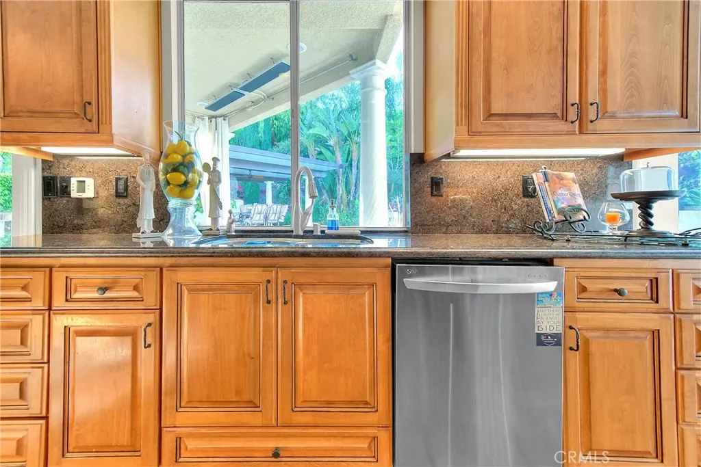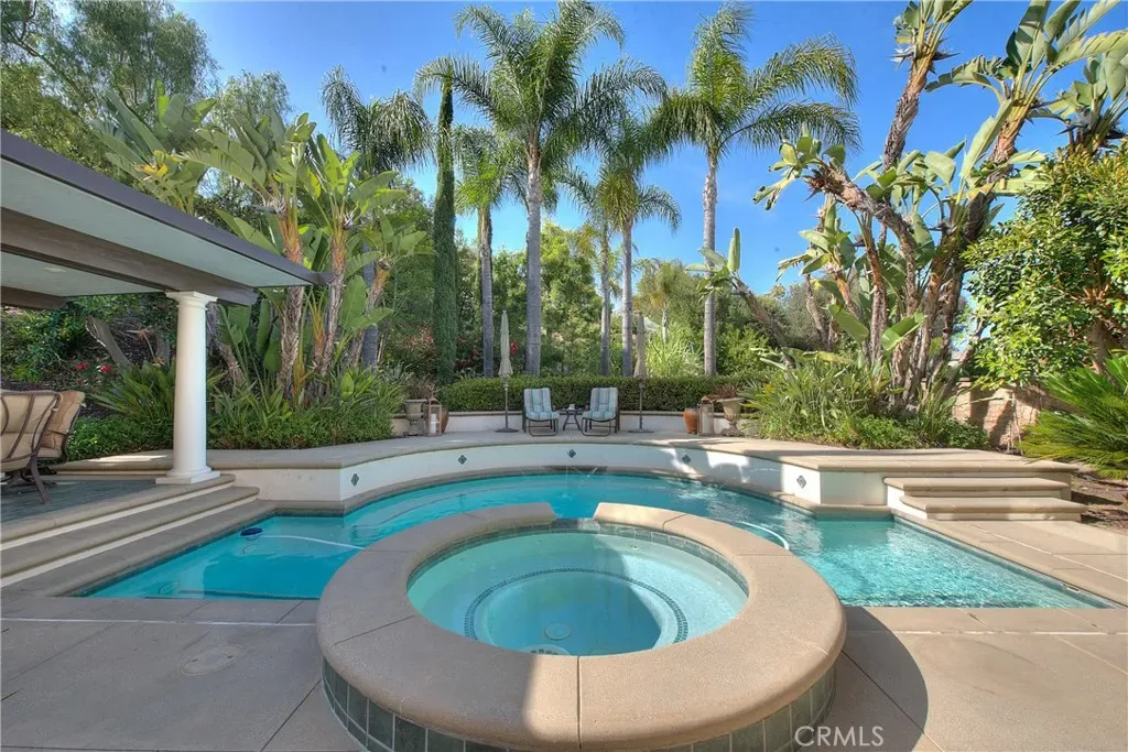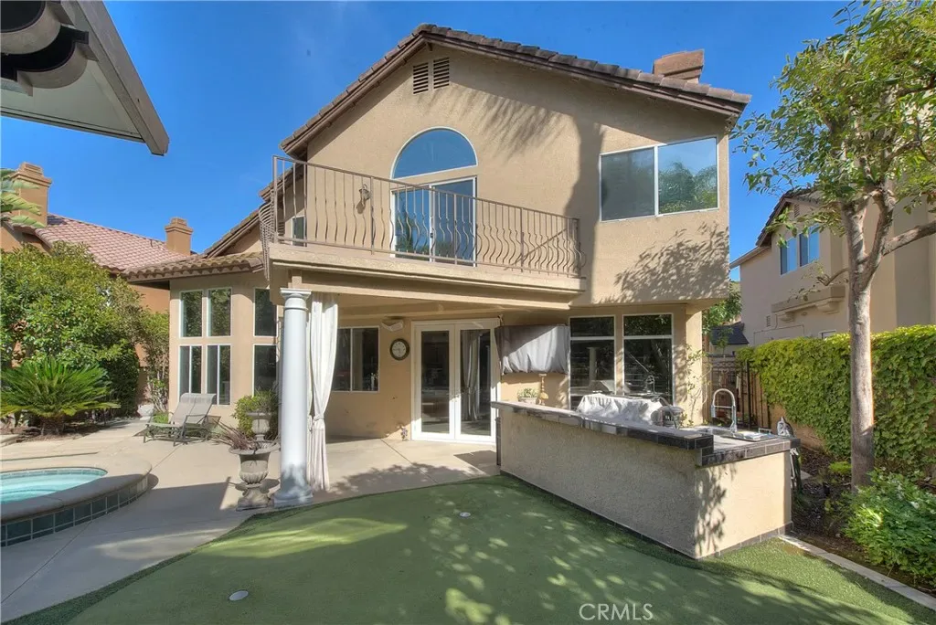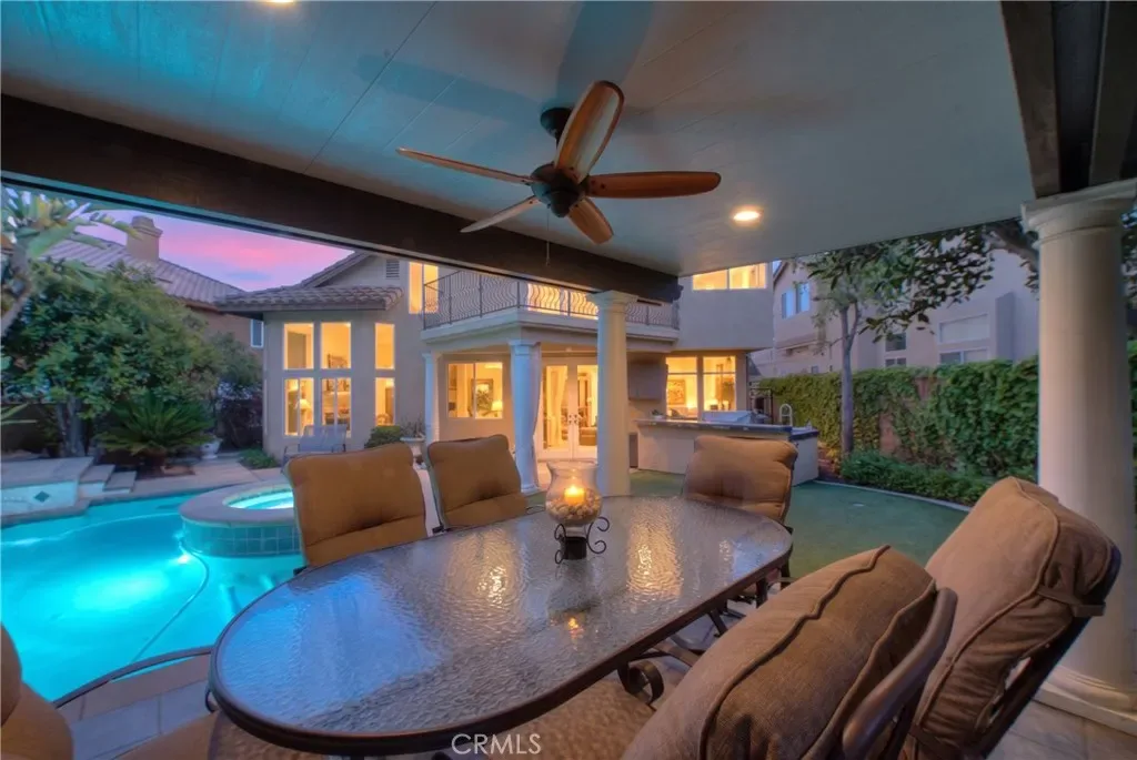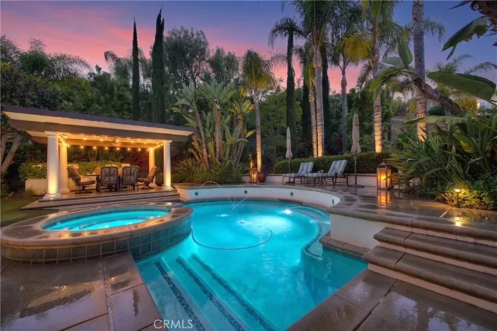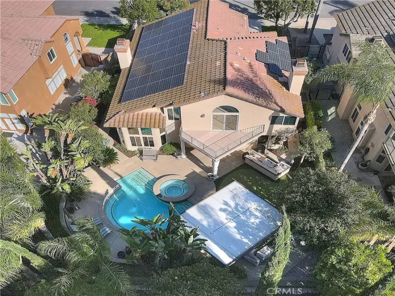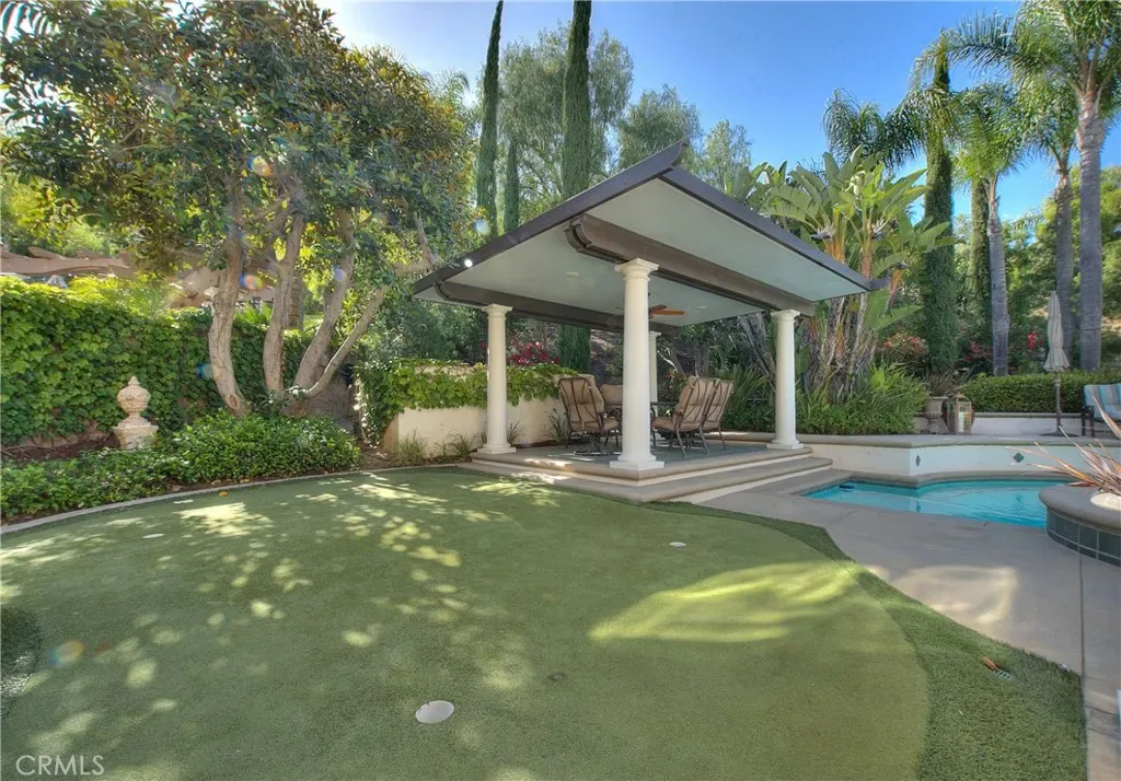 The backyard features an attached covered patio, a sparkling tropical style pool and spa, a built-in bbq area with a sink and refrigerator, and a putting green! The garage is worth mentioning as it is super clean with epoxy flooring, large built in cabinets and a 220v Tesla charger.