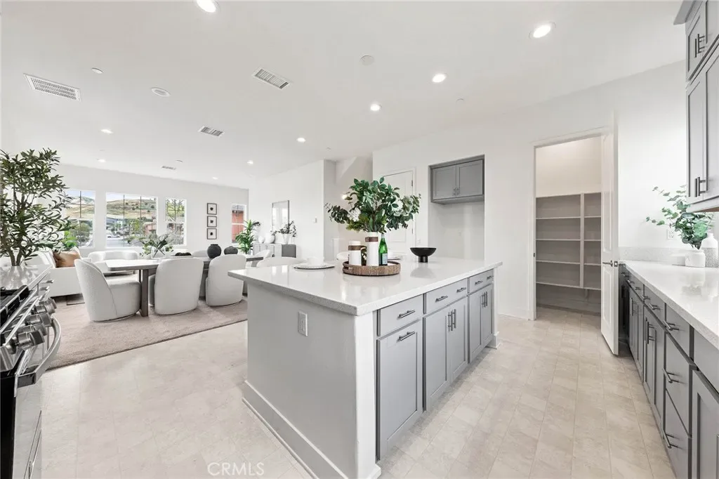 combining the kitchen, dining area, and living room—perfect for entertaining. The kitchen is a chef’s dream, equipped with a quartz center island, GE stainless steel