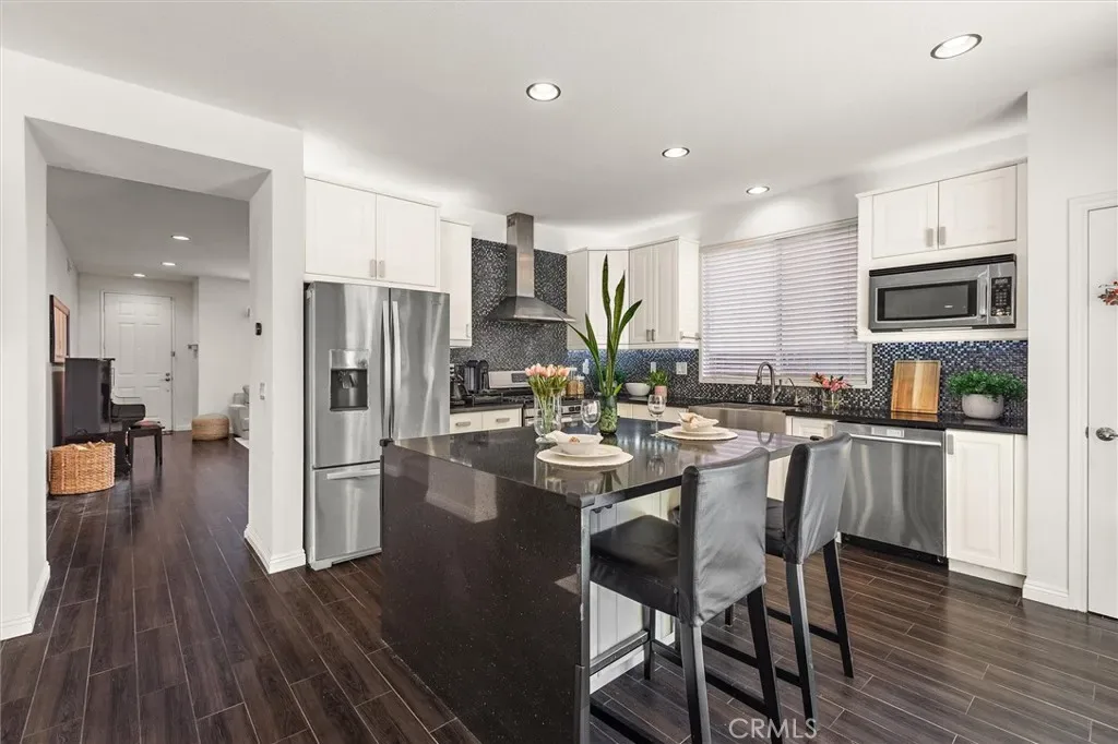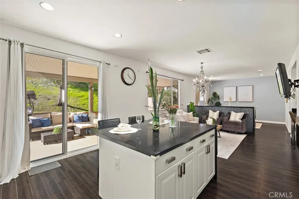 The front entry opens into a bright formal living room that creates a warm and inviting first impression. The home features an open layout with wood-look porcelain tile floors, recessed lighting, plantation shutters, and a remodeled kitchen with stainless steel appliances, reverse osmosis water system, and an oversized quartz island that flows seamlessly into the main living areas. Step through the sliding glass doors into a quiet, private backyard with a large aluminum patio cover and a balanced mix of hardscape and landscape, perfect for outdoor dining or relaxing.