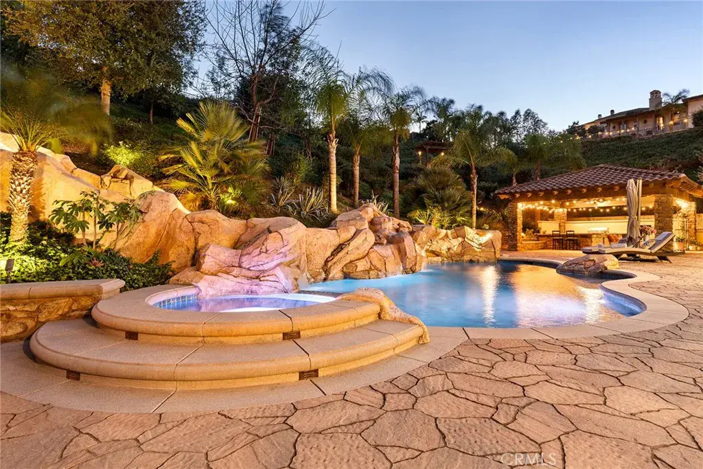 Resort-style backyard designed for year-round entertaining. Lush tropical landscaping surrounds a custom pool and spa with dramatic rock features and ambient lighting. Enjoy warm evenings by the outdoor fireplace, gather with friends at the covered lounge and bar area, or unwind poolside under the stars. Expansive hardscape patios provide multiple seating and entertaining zones, creating a private oasis that feels like a luxury retreat. Perfect for entertaining or quiet relaxation.