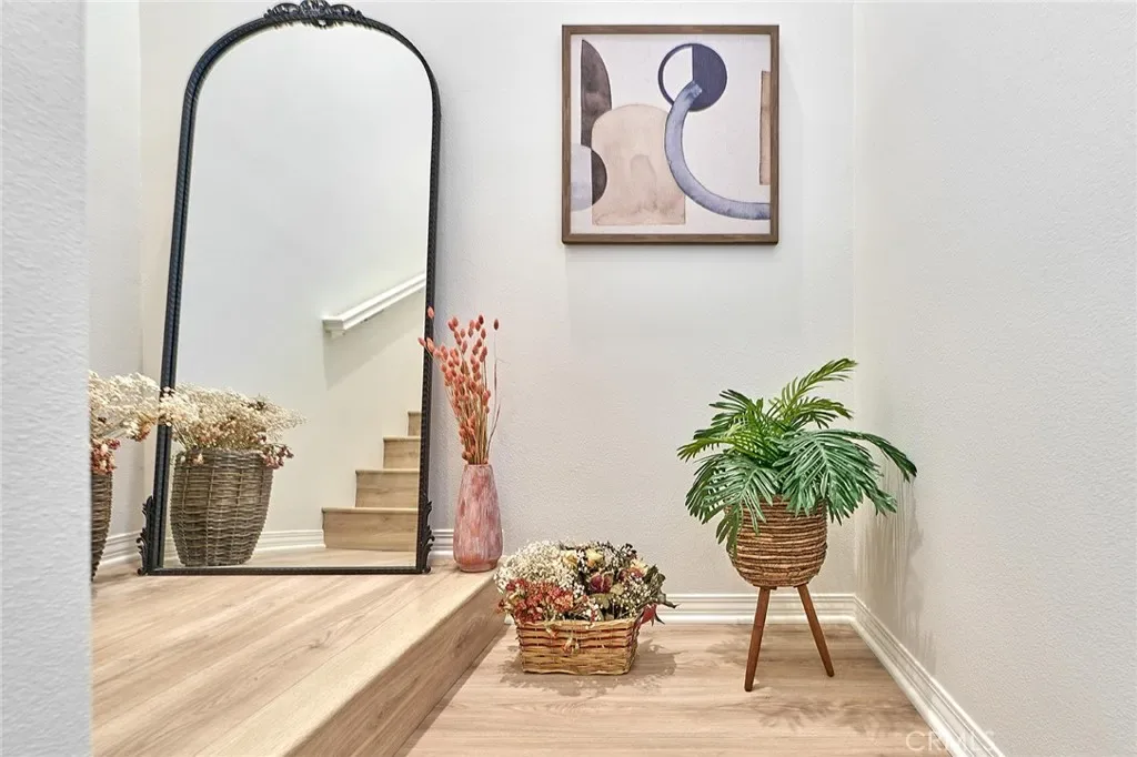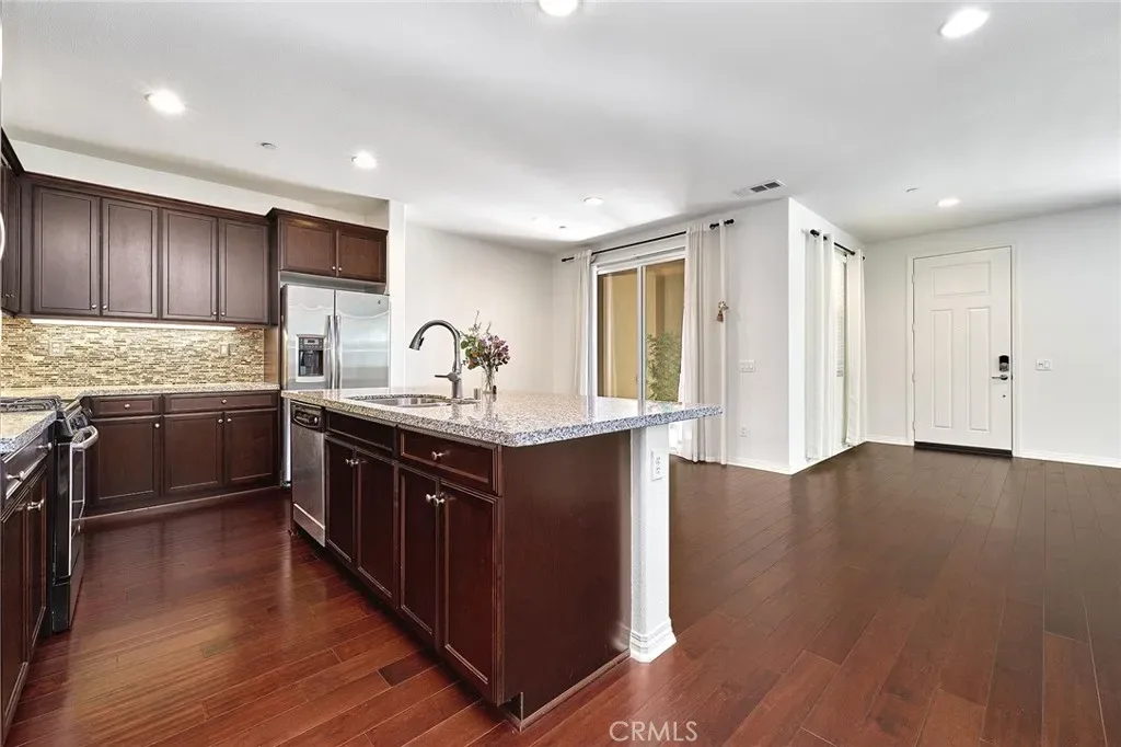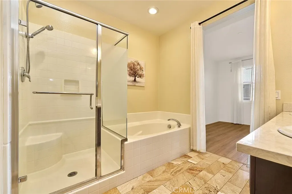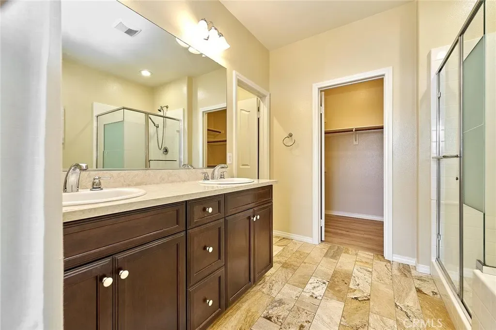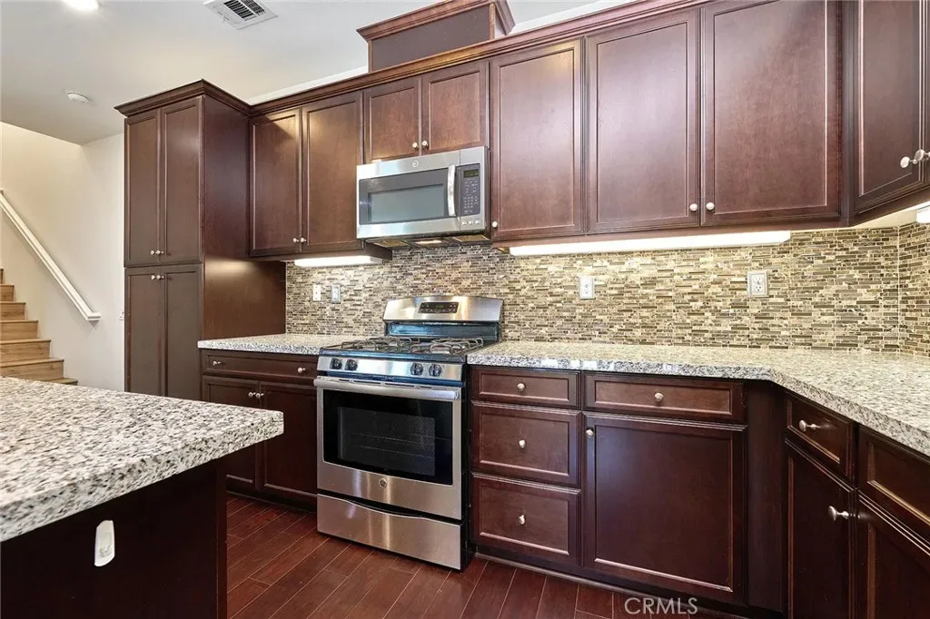 Welcome to this beautifully upgraded two story townhouse located in the highly desirable Morgan Square neighborhood within the College Park community of Chino. This well maintained home offers 2 spacious bedrooms and 2.5 bathrooms, combining modern comfort with an exceptional location. Unlike many homes in the community, this residence enjoys an open front setting with no buildings directly in front, allowing for a more open feel and pleasant views. The open concept main level features wide plank hardwood flooring throughout, a bright and inviting great room, and a dedicated dining area. The gourmet kitchen is designed for both functionality and style, showcasing granite countertops, a mosaic tile backsplash, custom cabinetry, stainless steel appliances, and a center island perfect for everyday living and entertaining. A generously sized powder room and a private covered patio provide added convenience and ideal indoor and outdoor living. Upstairs, you will find a convenient laundry room and two private en suite bedrooms. The primary suite features dual vanities, Travertine flooring, a separate soaking tub and shower, a walk in closet, and a private toilet room. The secondary suite also includes its own full bathroom, offering flexibility for guests or multi generational living. Additional highlights include a 2 car attached garage, tankless water heater, and designer interior paint. The home is also energy efficient with well maintained heating and cooling systems that help keep utility costs low throughout the year. Ideally situated facing the community picnic area with a playground just steps away. Residents of College Park enjoy resort style amenities, including two swimming pools, a spa, kids splash zone, fitness center, clubhouse, BBQ areas, multiple parks, basketball and tennis courts, and more. Located within the award winning Chino Valley Unified School District and close to shopping, dining, and major freeways, this home offers an outstanding opportunity for comfortable living in a vibrant community.