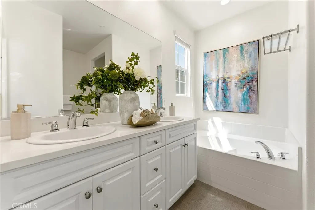 Upstairs features a versatile loft space suitable for a home office, media room, or additional living area. The primary suite offers a soaking tub, separate shower, dual vanities, and a walk-in closet. An upstairs laundry room provides added practicality and convenience.