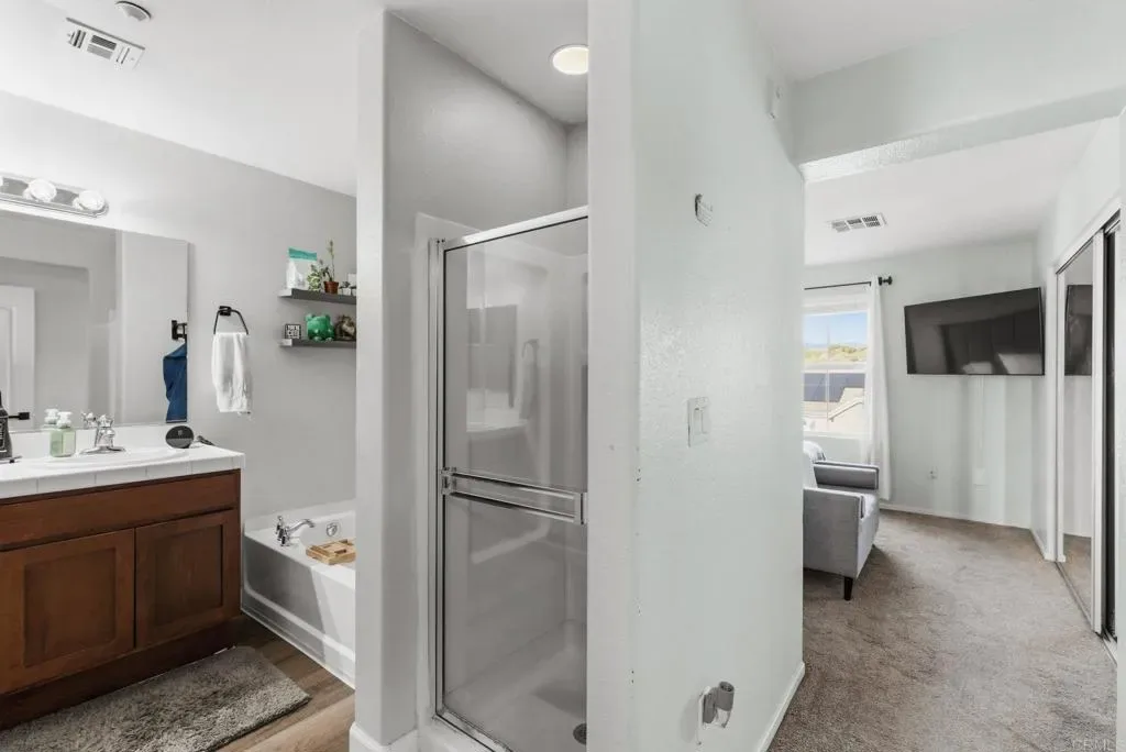 This beautifully cared for home is located in one of Eastlake’s most desirable communities Greystone. Situated on a quiet street, this residence offers a wonderful balance of comfort, flexibility, and the vibrant lifestyle that makes Eastlake such a sought after place to live. Step inside to a full bedroom and ensuite bath on the 1st floor and climb up to a bright, welcoming interior featuring an open and functional floor plan designed for both everyday living and entertaining. The kitchen serves as the centerpiece of the home, complete with modern cabinetry, stainless steel appliances, large centre island, and ample space to prepare meals while staying connected with family and guests. Recent updates throughout the home include partial fresh interior paint, new light fixtures, newer vanities in the bathrooms adding a refreshed and modern feel. The living and dining areas flow effortlessly together, creating an inviting setting for relaxing or hosting to then flow out to a cozy balcony. The layout is ideal for extended family, visiting guests, a private office, or potential rental use. All bedrooms feature built in closets, providing practical storage and organization, and each bedroom has it’s own bathroom. Upstairs, the primary suite offers a comfortable retreat where you wake up to beautiful mountain views, complete with a spacious closet! An additional upstairs bedroom has been upgraded with new carpet, USB charging outlets, and new tile flooring in the bathroom. This home also includes valuable energy efficient features such as solar panels, a Tesla Power wall battery in the garage, and a smart Nest thermostat for enhanced energy management and year round comfort. The attached 2 car garage adds everyday convenience along with additional storage. Living in Eastlake means enjoying well maintained neighborhoods and excellent community amenities. Residents have access to the community pools, nearby parks, playgrounds, and scenic walking trails that run throughout the area. Top rated Eastlake schools, neighborhood parks, and everyday conveniences are just minutes away. Otay Ranch Town Center is only about a 5 minute drive, offering a variety of restaurants, coffee shops, fitness studios, shopping, and a popular weekly farmers market. Commuters will also appreciate the easy access to major freeways while still enjoying the peaceful atmosphere of this established neighborhood. Whether you’re looking for flexible living space, a home that accommodates multigenerational living, or simply a place to enjoy the Eastlake lifestyle, this property presents a wonderful opportunity to own in one of Chula Vista’s most desirable areas.