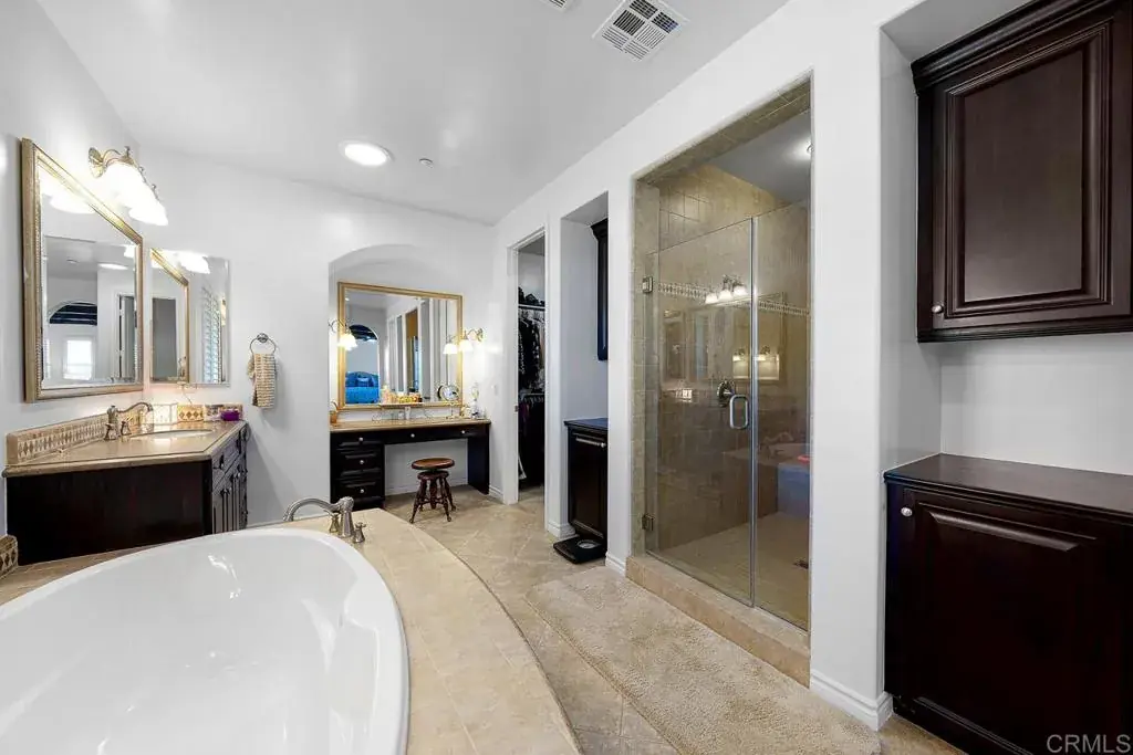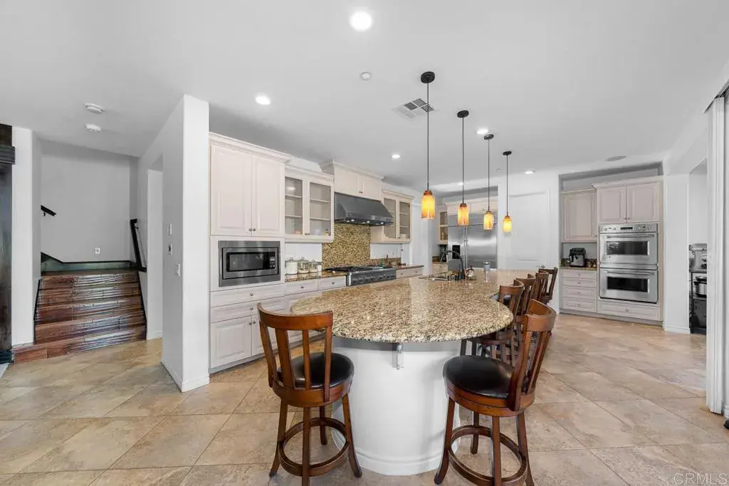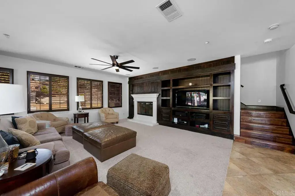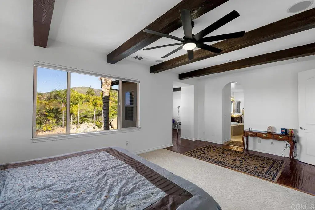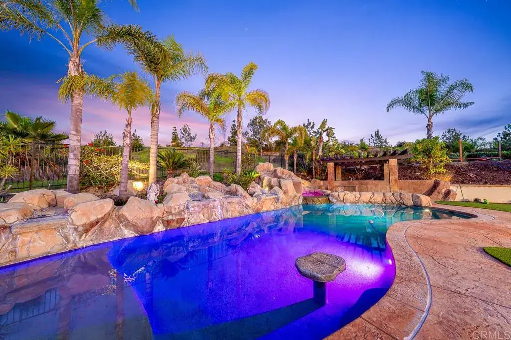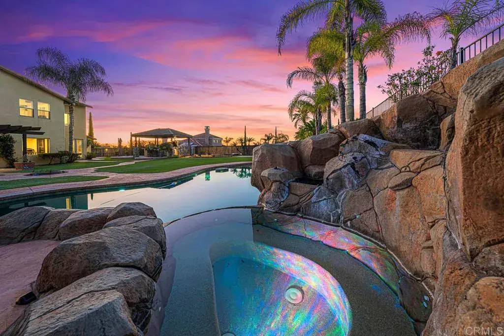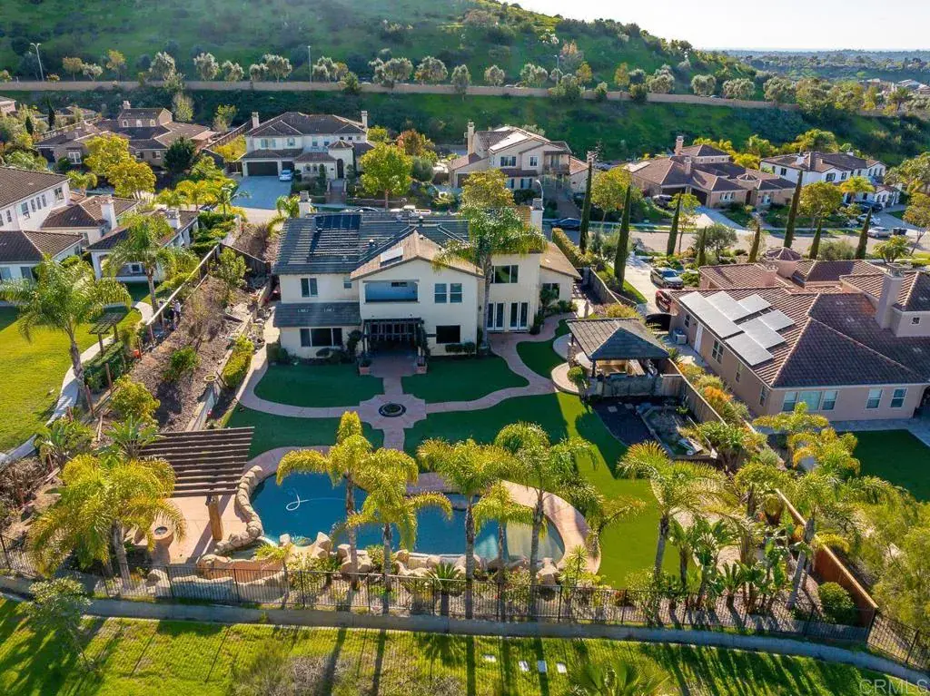 Welcome to an exceptional home in the highly desirable community of San Miguel Ranch, where comfort, design and lifestyle come together beautifully. Soaring ceilings and abundant natural light create a warm, inviting atmosphere, while the open-concept layout offers seamless flow for both everyday living and entertaining. The chef’s kitchen is the heart of the home, featuring an oversized island ideal for gatherings, GE Monogram stainless steel appliances, generous cabinetry and expansive prep space. A rare highlight is the all en-suite bedroom layout, offering privacy and convenience for family and guests alike. The primary suite serves as a peaceful retreat with a private balcony, open space views, a spacious lounge area, and dual walk-in closets. Step outside to a resort-style backyard designed for entertaining, complete with a pool featuring a waterfall and slide, outdoor BBQ kitchen, fire pit, and multiple seating areas. Additional features include surround sound speakers, decorative ceiling beams, custom shutters, wood flooring, ceiling fans throughout, paid solar, two fireplaces, a detached office with bifold doors and a three-car garage. Conveniently located near parks, shopping, dining, top-rated schools and easy access to the 125 freeway, this home offers the perfect blend of luxury, comfort, and convenience.