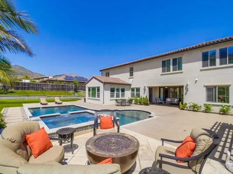 Welcome to a residence that redefines luxury, comfort, and smart living—nestled in the highly sought-after Rolling Hills Ranch II. With stunning mountain views resort-style backyard complete with pool and spa, this elegant home is a private retreat designed for the modern lifestyle. Step into a breathtaking backyard oasis featuring low-maintenance turf, a paved patio, pergola, built-in outdoor kitchen, fire pit, and a heated pool and spa—all fully controlled by your smartphone. Whether you’re hosting a lively gathering or enjoying a peaceful evening under the stars, this outdoor space is designed to elevate every moment. Inside, every room tells a story. Each space has its own distinct personality, thoughtfully styled with elegant décor, sophisticated touches, and meticulous attention to detail. From the formal living and dining rooms to the cozy family room with designer-appointed finishes, the home radiates warmth and refinement. The gourmet kitchen is a chef’s dream—featuring granite countertops, upgraded backsplash, upgraded flooring, a large island, a pot filler above the stove, and a spacious walk-in pantry. Just off the kitchen, the laundry room includes a built-in desk, ideal for a home office or command center. Upstairs, the luxurious primary suite is a serene sanctuary with a dedicated sitting area and a spa-inspired bathroom complete with dual granite vanities, a soaking tub, oversized shower, and walk-in closet. Three additional bedrooms complete the upper level—one with its own private bath and two sharing a Jack-and-Jill bathroom, each with its own unique charm. Additional highlights include: Fully paid solar panels All appliances convey to the buyer Double-pane windows Situated in one of Chula Vista’s premier communities, this home offers a peaceful setting with convenient access to top-rated schools, scenic parks, and family-friendly amenities. Experience timeless elegance, high-tech convenience, and resort-style living—all in one extraordinary home.