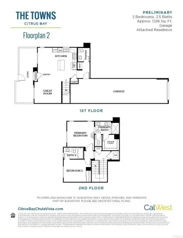 This stunning new 2-story townhome in the vibrant Citrus Bay community of Chula Vista is ready for move-in and packed with style. It features 2 spacious bedrooms, 2.5 modern bathrooms and 1,126 square feet of living space. Enjoy a private patio with vinyl fencing and a gate, perfect for outdoor entertaining. The 2-car garage features tandem parking and extra space for storage. The home has beautiful finishes throughout-including sleek white soft-close cabinetry, quartz countertops with full herringbone pattern tile kitchen backsplash, 5-burner gas range, microwave hood, dishwasher, built-in trash/recycle bin and upgraded flooring (luxury vinyl plank flooring on the entire first floor, with ceramic tile & carpet in bedrooms/baths). Just steps from the scenic bay and near the Luxurious Gaylord Pacific Resort, this home places you in the heart of Chula Vista with walkable access to restaurants, the Chula Vista Center Mall, and more. Beyond the home itself, the community offers a beautiful sparkling pool, BBQ area and a future Citrus Bay park, perfect for downtime or playtime with family and friends. Brand new construction; photos represent the professionally decorated model home.