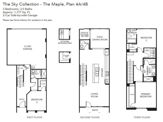 This thoughtfully designed “Maple” floorplan features approximately 1,777 square feet with 3 bedrooms and 3.5 baths. The first floor includes a private bedroom with en-suite bath and walk-in closet—perfect for guests or a home office—along with additional storage and a spacious side-by-side two-car garage.