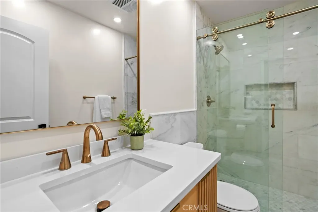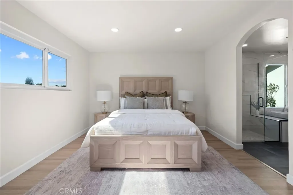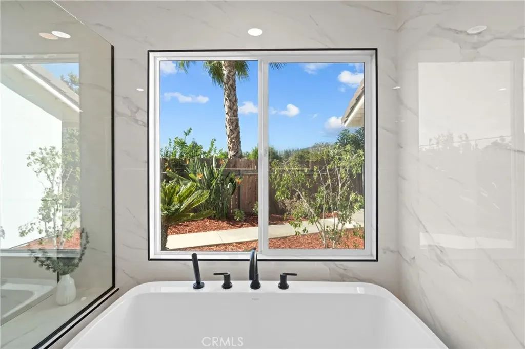 The primary suite serves as a peaceful private retreat, featuring a spa inspired bathroom, a serene en-suite bath with views of the lush garden beyond, and a spacious walk-in closet. The house features three additional generously-sized bedrooms, each ideal for a growing family, guest accommodations, a home office, or a creative studio. The two well-appointed hallway bathrooms include a stylish first bathroom and a second bathroom with direct access to the backyard – perfect for outdoor gatherings or a quick rinse after enjoying the garden or pool.