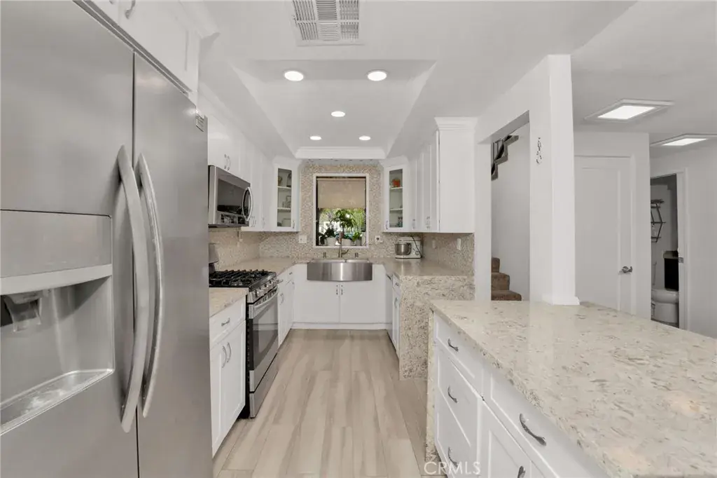 Welcome to The Brooks of Claremont! This beautifully updated end-unit condo is located in a highly desirable gated community, just minutes from the prestigious Claremont Colleges and Claremont Unified schools. Inside, you’ll discover the largest model offered at The Brooks, featuring a bright and open floor plan with luxury vinyl plank flooring, fresh neutral paint, recessed lighting, crown molding, updated baseboards, and a cozy fireplace. The spacious living room is enhanced by double sliding glass doors that flood the home with natural light and lead to a private patio—perfect for relaxing or entertaining. The modern kitchen is a true highlight with crisp white cabinetry, granite countertops, stainless steel appliances (stove, refrigerator, dishwasher, and microwave), recessed lighting, and a breakfast bar for casual dining. For added convenience, this home includes an indoor laundry room and a beautifully remodeled powder room downstairs. Upstairs, the expansive primary suite offers a large walk-in closet and tranquil views of the community pool. The hallway bathroom has been tastefully remodeled with Quartz countertops, dual sinks, new lighting, and an updated shower. A secondary bedroom provides comfort and versatility, ideal for family, guests, or a home office. Community amenities include a sparkling pool and spa, all within a beautifully maintained and secure gated setting. Additional highlights include a two-car detached garage, upgraded staircase, and countless other modern touches. With its prime location, location, location, this move-in ready home blends style, comfort, and convenience—just minutes from shopping, dining, parks, and top-rated schools in one of Claremont’s most sought-after neighborhoods.