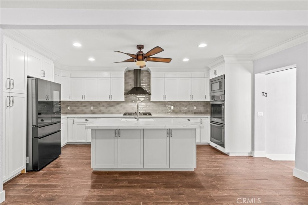 The remodeled kitchen offers quartz countertops, a large center island with farmhouse sink, shaker-style soft-close cabinetry, and stainless steel appliances including a double oven and gas range with hood. Just beyond the kitchen, a farmhouse-style sliding door opens to an expanded living area that adds exceptional flexibility to the home.