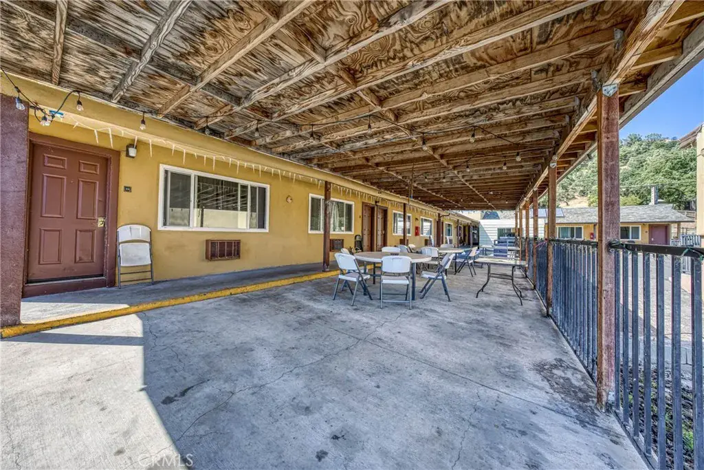 The property features a blacktop parking lot, an oversized covered lakeside patio perfect for weddings and events, a private dock ideal for fishing or guest relaxation, and a convenient on-site laundry facility. A spacious apartment above the front office offers the perfect setup for a live-in manager or additional rental income.