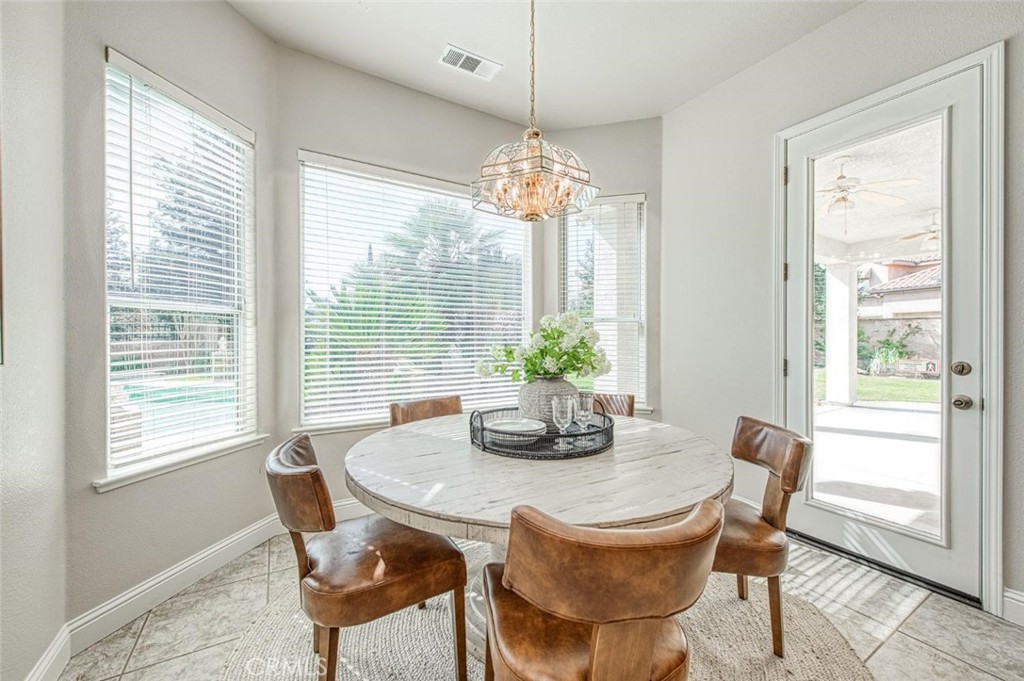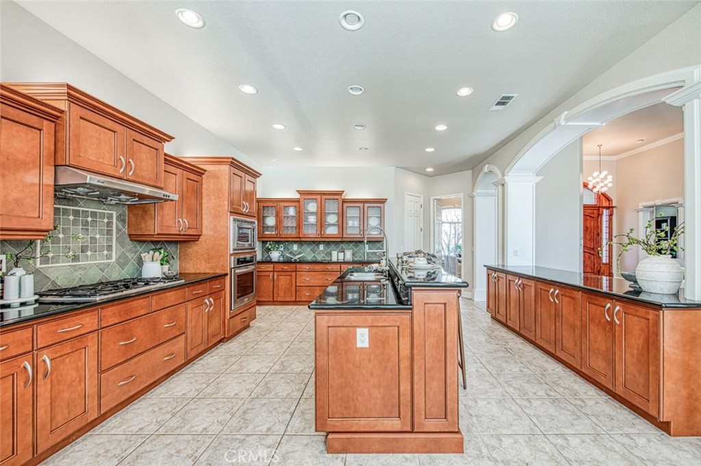 The chef’s kitchen offers extensive storage, custom cabinetry, granite countertops, stainless steel appliances, a five-burner gas stove, breakfast bar, large pantry, and an oversized dining nook with direct backyard access.