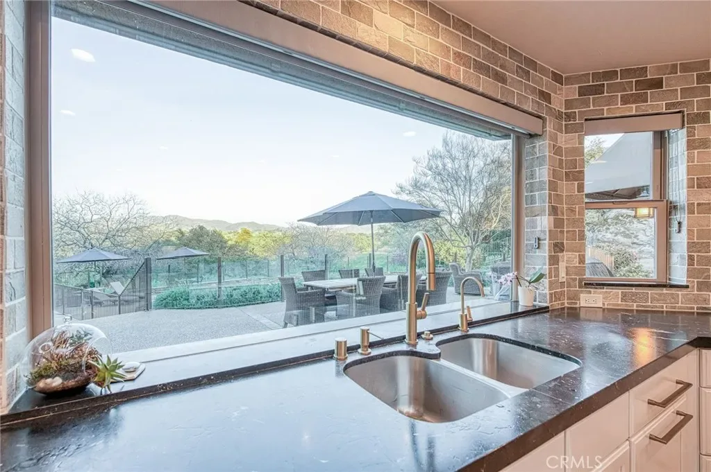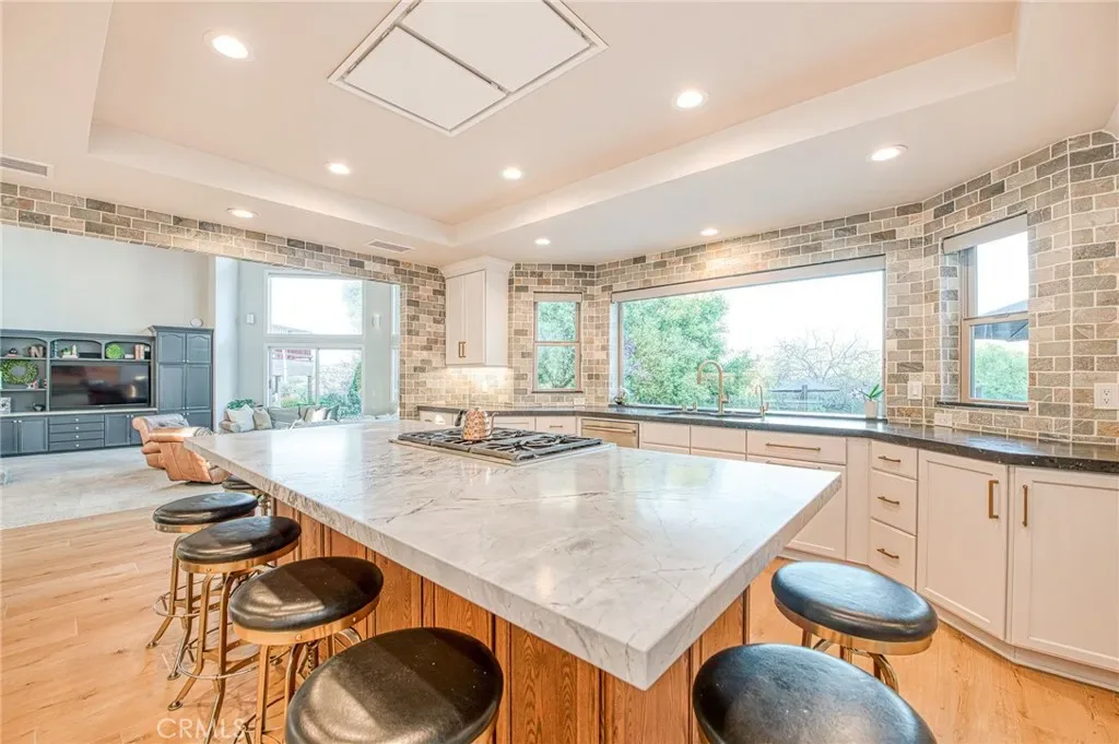 Inside, the home has been thoughtfully refreshed with resurfaced plaster-finish walls, fresh paint, and newly installed luxury vinyl plank flooring. The spacious kitchen was beautifully remodeled and is designed for both everyday living and entertaining, featuring leathered granite countertops, a large center island, a walk-in pantry, and a picture window that frames the surrounding landscape. Premium appliances include a built-in refrigerator, wine fridge, ice maker, and additional beverage refrigeration.