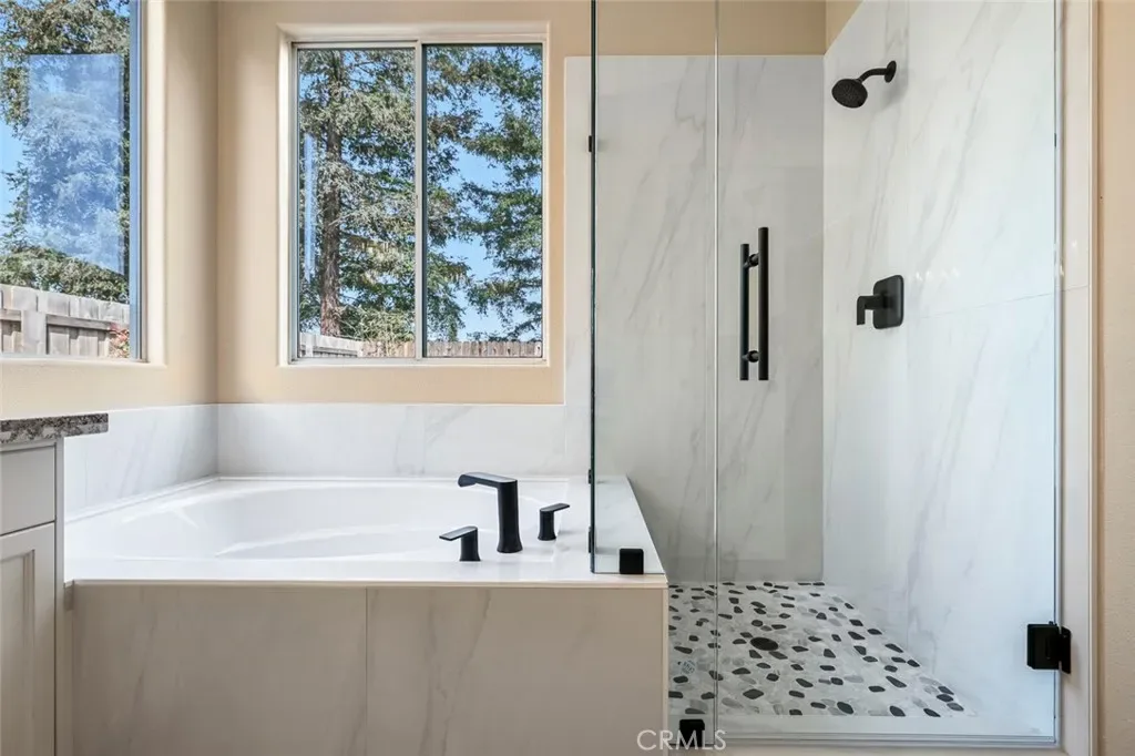 The oversized primary suite serves as a private retreat, complete with a spa-inspired ensuite bath showcasing designer tile, a new shower enclosure, and refined finishes. The guest bathroom has also been updated, and new fixtures throughout the home add a fresh, contemporary touch. Comfort and efficiency are enhanced by a brand-new HVAC system installed in 2024, along with added insulation and a newly installed fence.