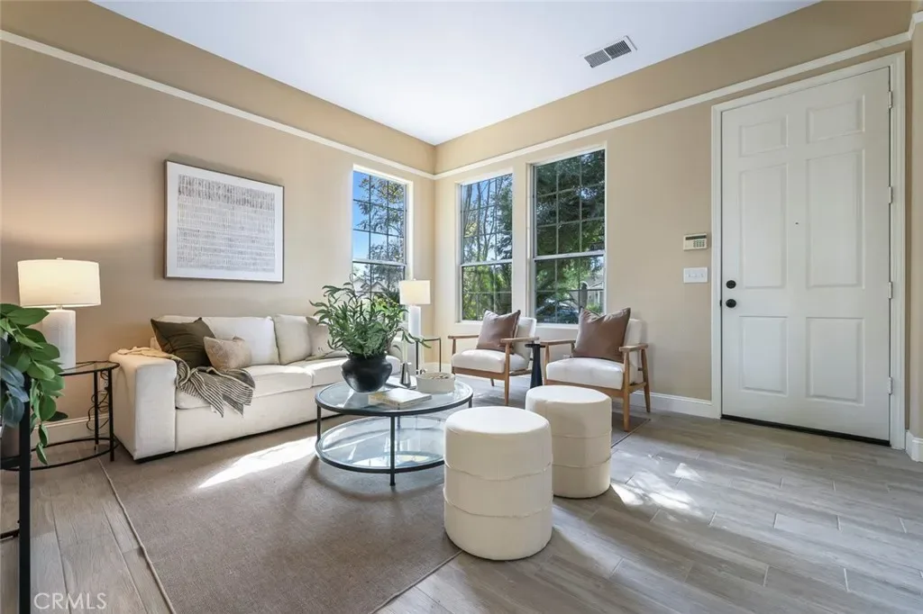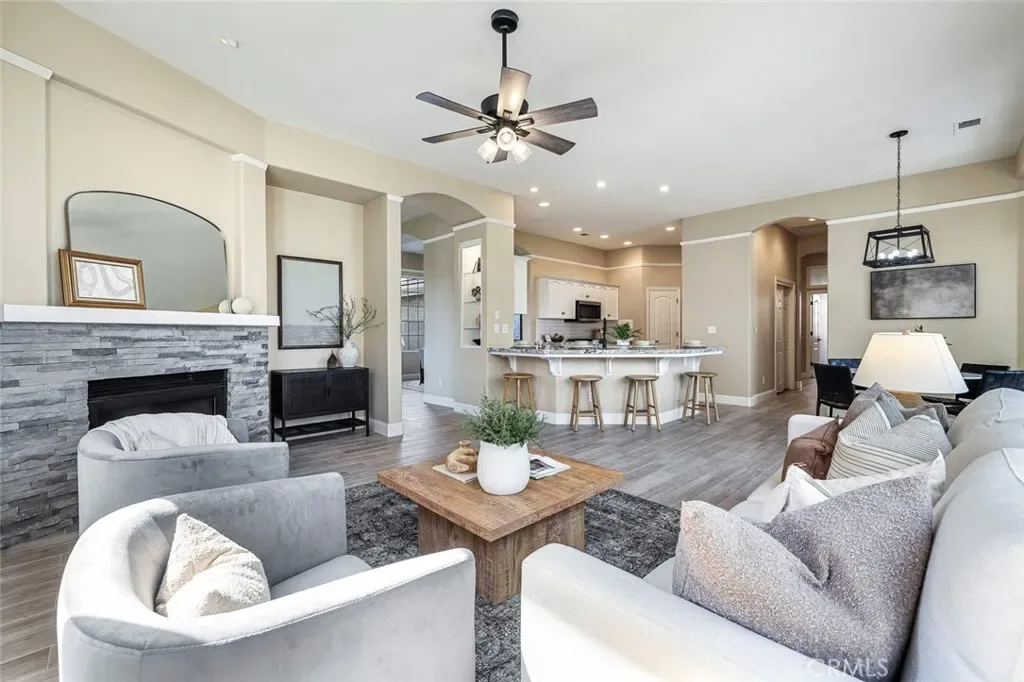 From the moment you arrive, the fresh interior AND exterior paint create a crips, clean, and inviting presence. Inside, brand-new flooring flows throughout, featuring elegant wood plank tile complemented by plush new carpet and updated baseboards. The thoughtfully designed layout offers dual living areas, providing flexibility for both relaxation and entertaining, highlighted by a beautifully refreshed fireplace with new stonework and a custom mantle.