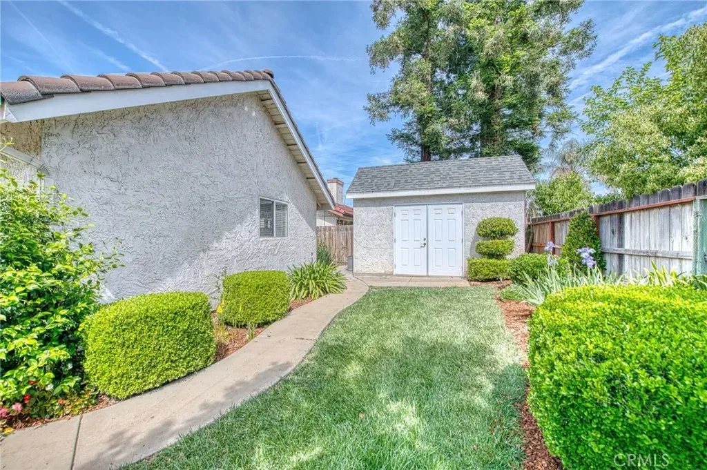Enjoy a beautifully landscaped backyard with mature trees, including lemon, orange, crepe myrtle, and crabapple, creating a private, park-like setting. The insulated shed is perfect for storing gardening tools, equipment, etc. The three-tier water feature adds a tranquil touch.